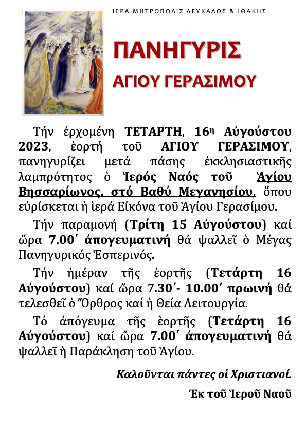 Τήν ἐρχομένη ΤΕΤΑΡΤΗ, 16η Αὐγούστου 2023, ἑορτή τοῦ ΑΓΙΟΥ ΓΕΡΑΣΙΜΟΥ, πανηγυρίζει μετά πάσης ἐκκλησιαστικῆς λαμπρότητος