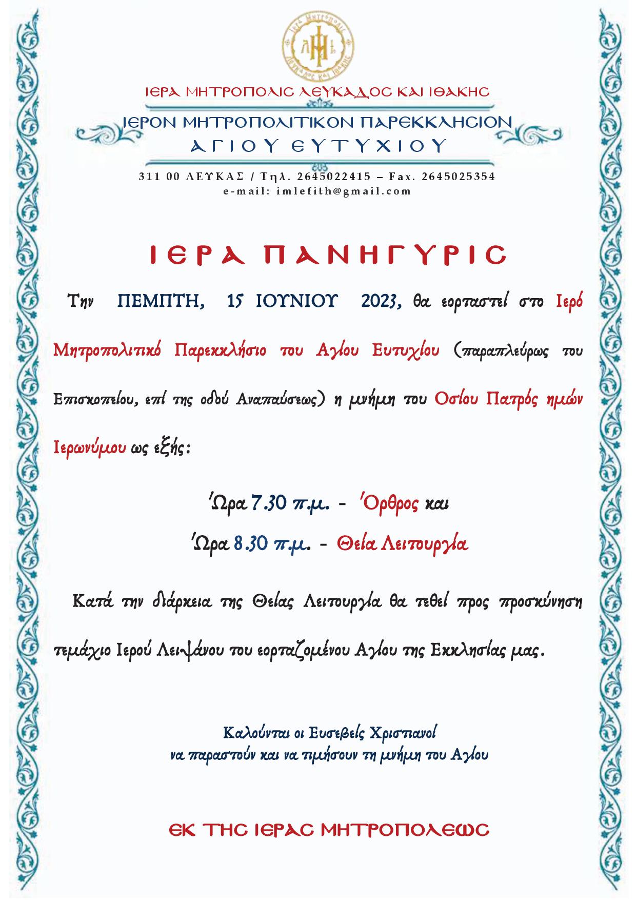 Την ΠΕΜΠΤΗ, 15 ΙΟΥΝΙΟΥ 2023, θα εορταστεί στο Ιερό Μητροπολιτικό Παρεκκλήσιο του Αγίου Ευτυχίου