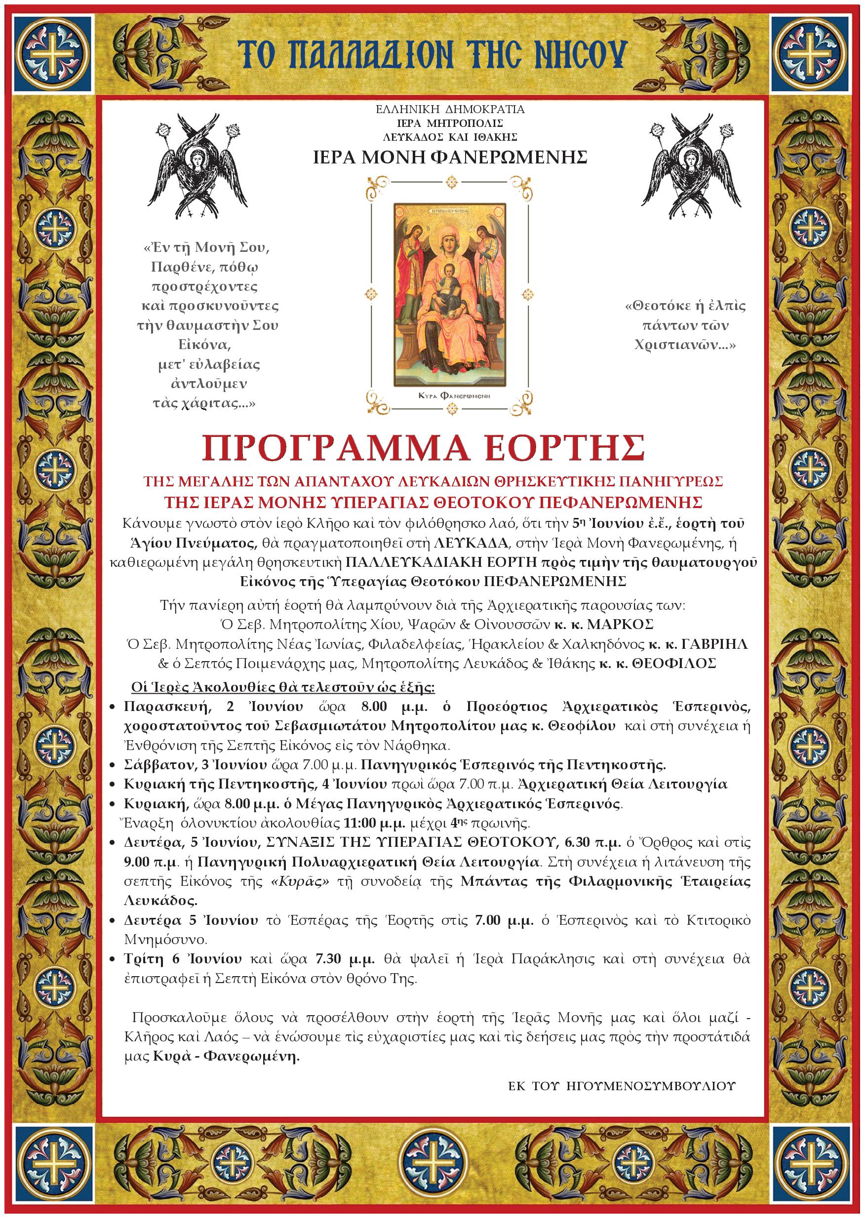 Ακολουθεί πρόγραμμα εορτής της μεγάλης των απανταχού Λευκαδίων Θρησκευτικής Πανηγύρεως της Ιεράς Μονής Υπεραγίας Θεοτόκου