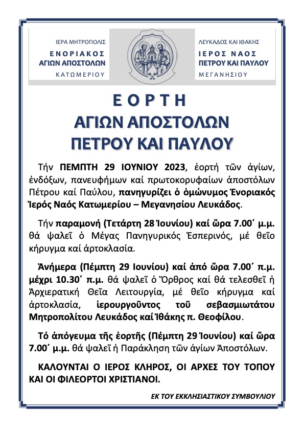 ΕΟΡΤΗ ΑΓΙΩΝ ΑΠΟΣΤΟΛΩΝ ΠΕΤΡΟΥ ΚΑΙ ΠΑΥΛΟΥ Τήν ΠΕΜΠΤΗ 29 ΙΟΥΝΙΟΥ 2023, ἑορτή τῶν ἁγίων,