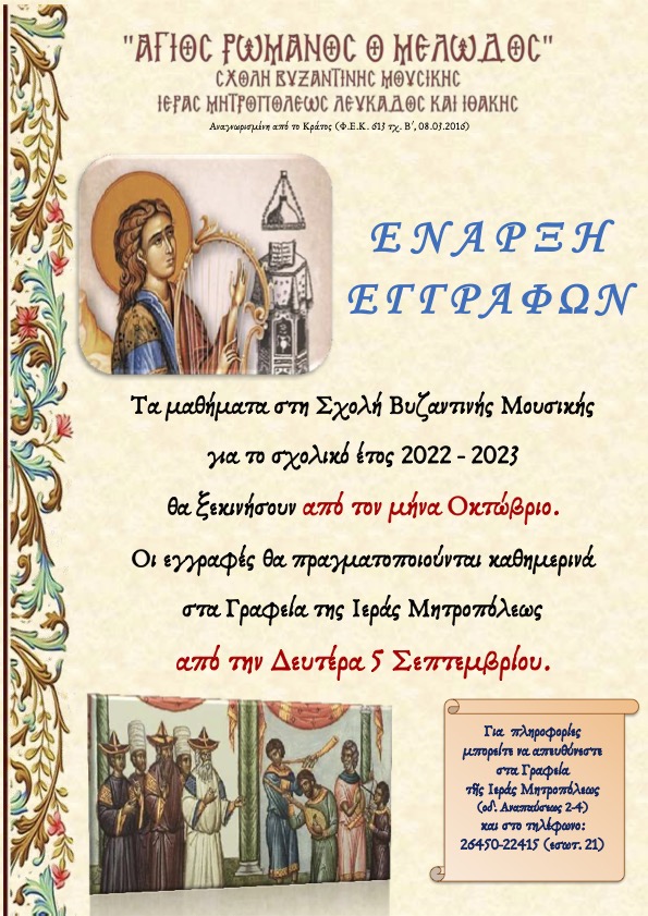 Κάνουμε γνωστό ότι τα μαθήματα στη Σχολή Βυζαντινής Μουσικής για το σχολικό έτος 2022 -