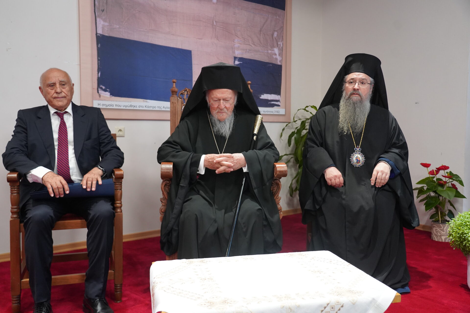 Κατά την άφιξή του, τον Παναγιώτατο, τον οποίο συνόδευε ο επιχώριος Μητροπολίτης Λευκάδος και Ιθάκης Σεβ. κ. Θεόφιλος, υποδέχθηκαν ο Περιφερειάρχης Ιονίων Νήσων Εντιμ. κ. Ιωάννης Τρεπεκλής, με τον Αντιπεριφερειάρχη Π.Ε. Λευκάδας Εντιμ. κ. Αντώνιο Δουβίτσα, και ο Δήμαρχος Λευκάδας Εντιμ. κ. Ξενοφών Βεργίνης.