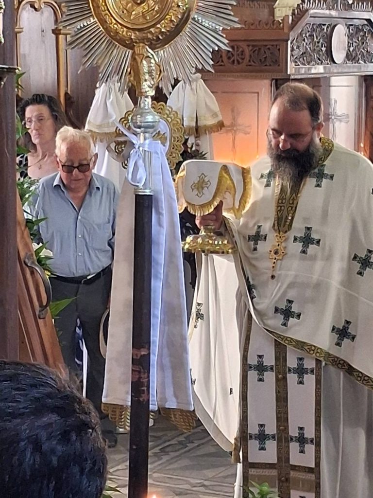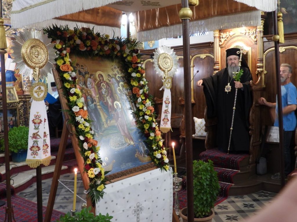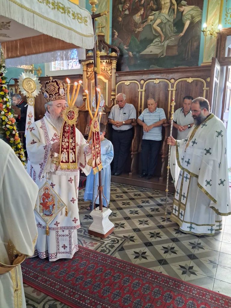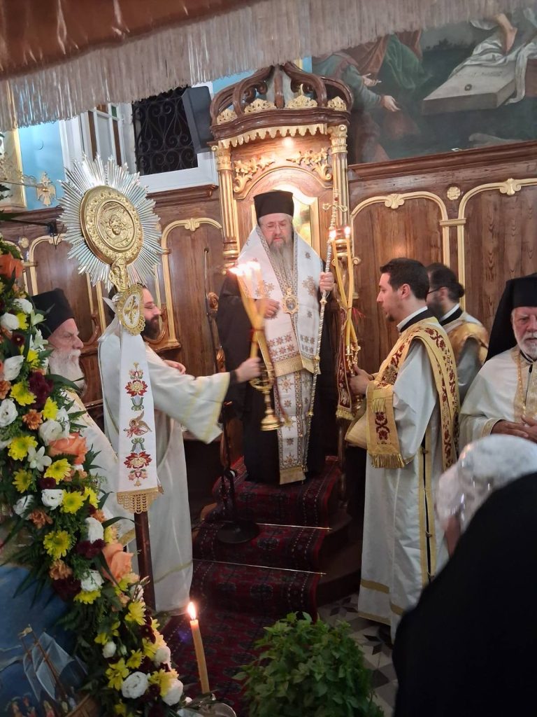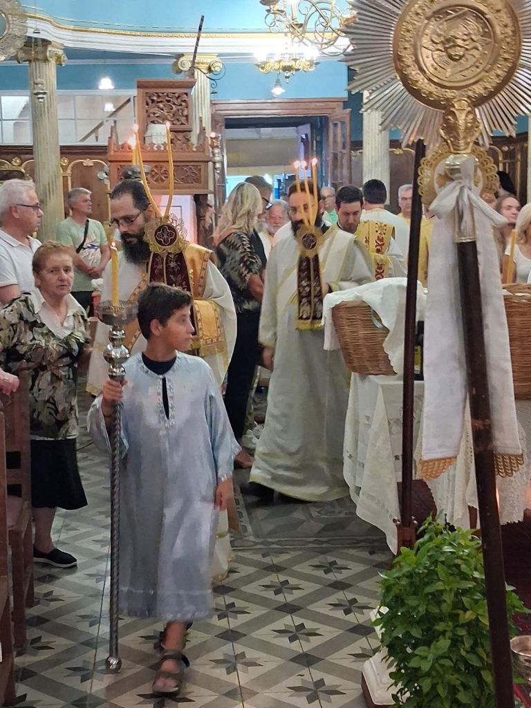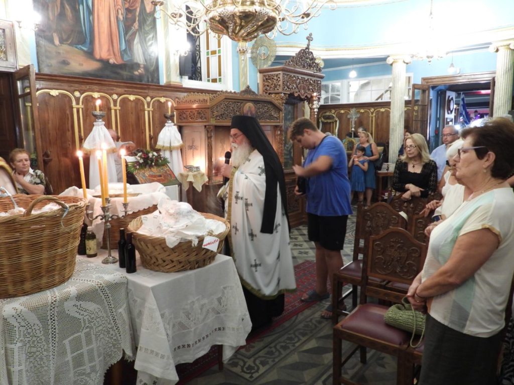 Το πρωί της Κυριακής, 17 Αυγούστου εψάλη η Ακολουθία του Όρθρου και στη συνέχεια τελέσθηκε Πανηγυρική Αρχιερατική Θεία Λειτουργία, προεξάρχοντος του Σεβασμιωτάτου Ποιμενάρχου μας κ. Θεοφίλου. Τον θείο λόγο κήρυξε ο Σεβασμιώτατος Μητροπολίτης μας λαμβάνοντας αφορμή από την Ευαγγελική περικοπή της ημέρας. Ο Σεβασμιωτάτος Ποιμενάρχης μας δεν παρέλειψε μεταξύ άλλων να μοιράσει το αντίδωρο και τον άρτο, ευχόμενος προσωπικά στον ευσεβή κλήρο και τον φιλόχριστο λαό έτη πολλά, καρποφόρα κι ευλογημένα κατ´άμφω
