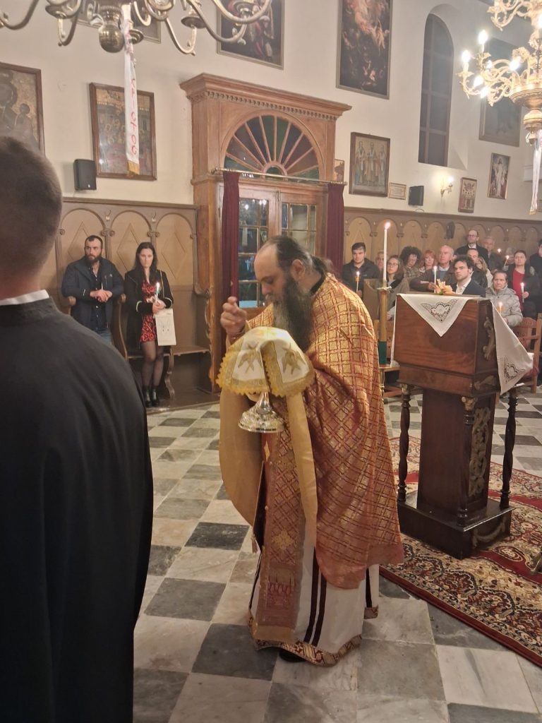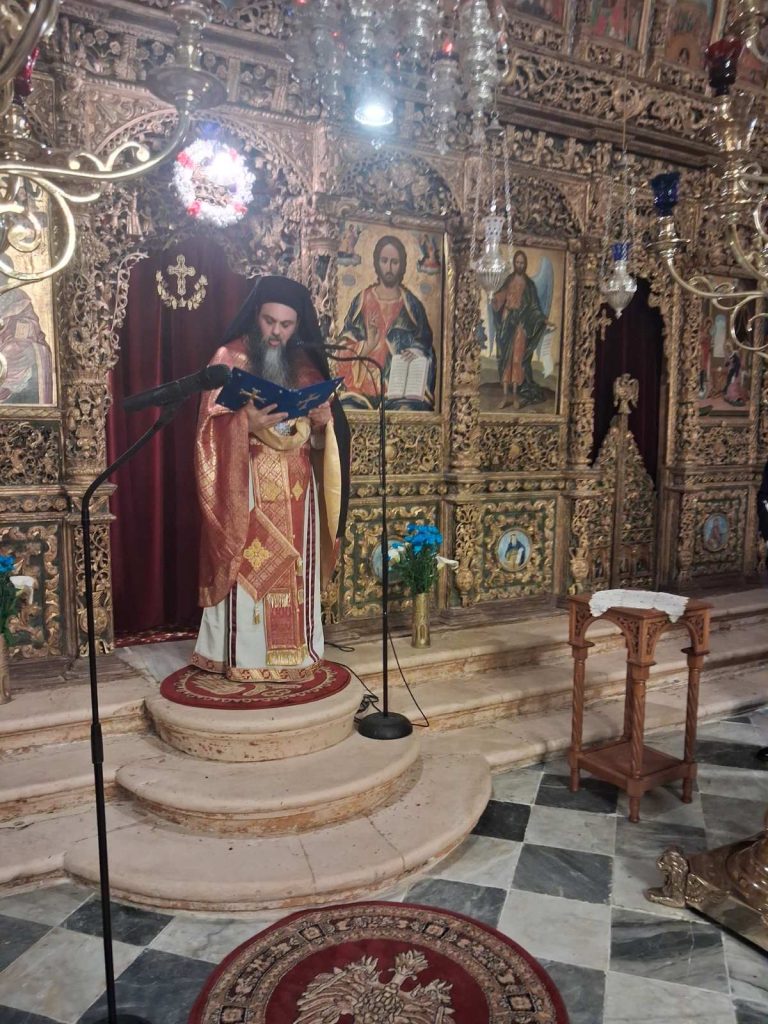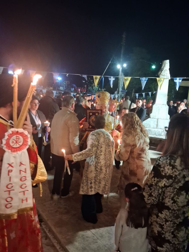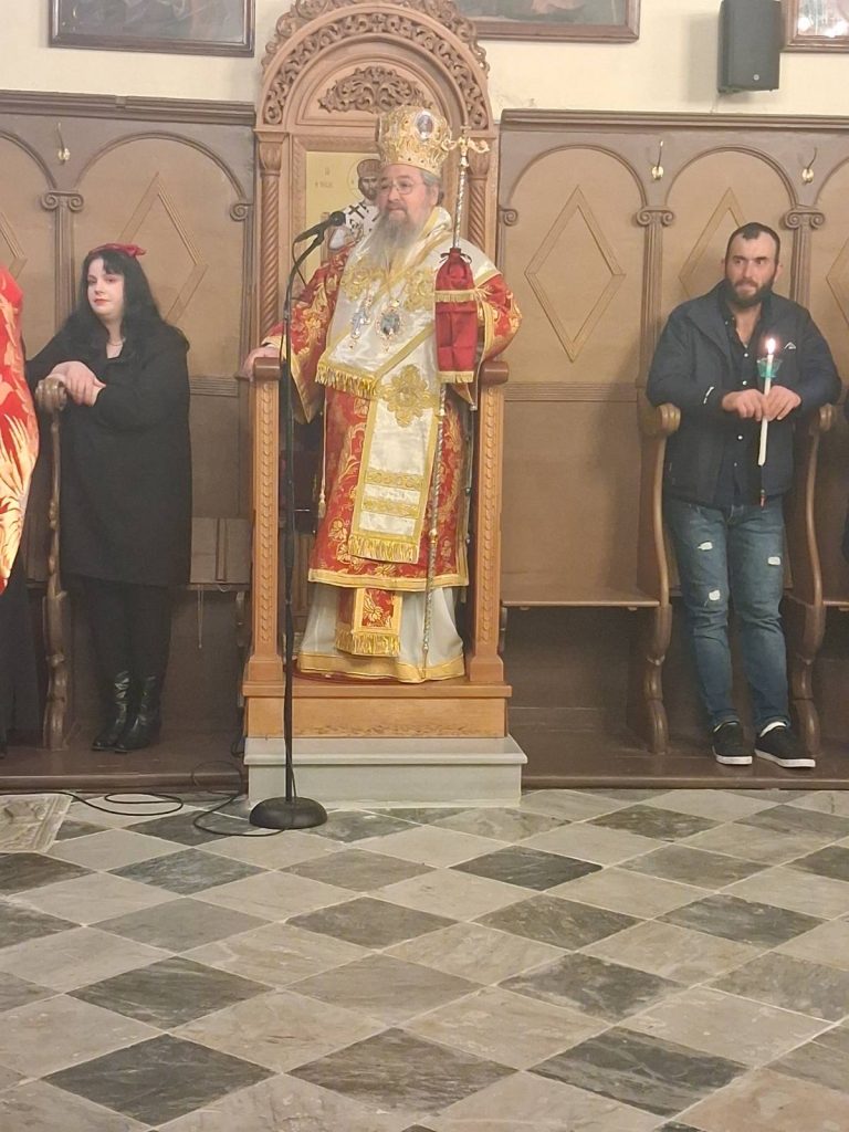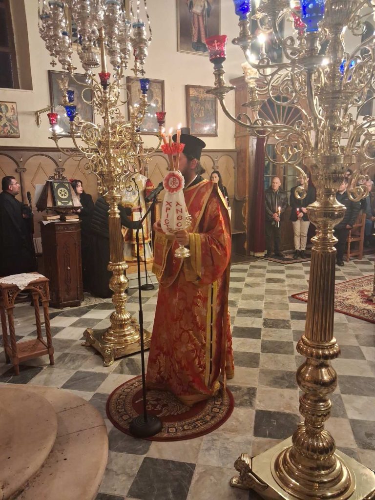 Το βράδυ του Μεγάλου Σαββάτου, 11 Απριλίου 2025 και ώρα 11.15 μ.μ. ο Σεβασμιώτατος Ποιμενάρχης μας μετέβει στον Ιερό Μητροπολιτικό Ναό Εισοδίων της Θεοτόκου Βαθεός Ιθάκης όπου και τέλεσε την Ακολουθία της Αναστάσεως. Μέσα σε κατανυκτική ατμόσφαιρα ο Σεβασμιώτατος, ο κλήρος και ο λαός έψαλλαν στον προαύλιο χώρο του Ιερού Ναού το «Χριστός Ανέστη». Στη συνέχεια προεξήρχε της Αναστάσιμης Αρχιερατικής Θείας Λειτουργίας πλαισιωμένος από τον εφημέριο, Πανοσ. Αρχιμανδρίτη π. Σεβαστιανό Μόσχο και τον ευλαβέστατο διάκονο π. Καλλίνικο Καρανθίμου. Tο παρόν μεταξύ άλλων έδωσε ο Γενικός Γραμματέας του Υπουργείου Ναυτιλίας και Νησιωτικής Πολιτικής, κ. Μανώλης Κουτουλάκης, ο Δήμαρχος Ιθάκης κ. Διονύσιος Στανίτσας και οι στρατιωτικοί και πολιτιστικοί φορείς του τόπου. Πριν το πέρας της Αναστάσιμης Θείας Λειτουργίας ο Σεβασμιώτατος Μητροπολίτης μας ανάγνωσε τον Κατηχητικό Λόγο του Αγίου Ιωάννου του Χρυσοστόμου και ευλόγησε τα πασχαλινά αυγά ενώ δεν παρέλειψε να τονίσει στην σύντομη ομιλία του την βαθύτερη σημασία της Ανάστασης του Κυρίου μας, της παραμονής των πιστών στην Αναστάσιμη Θεία Λειτουργία και της μετάληψης των Αχράντων Μυστηρίων. Στην συνέχεια και αφού έψαλε κλήρος και λαός το ¨Χριστός Ανέστη¨ μοιράστηκε στο πολυπληθές εκκλησίασμα το ευλογημένο αντίδωρο.