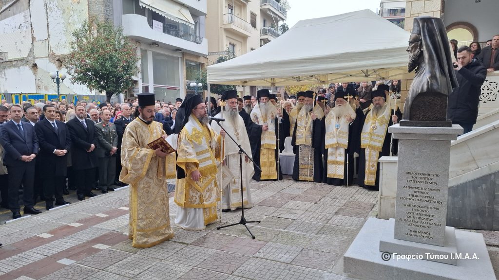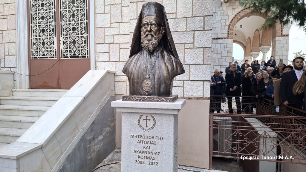 Ακολούθησε η τέλεση του Αρχιερατικού Μνημοσύνου υπέρ Αναπαύσεως του μακαριστού Μητροπολίτου και στη συνέχεια, στον προαύλιο χώρο, έμπροσθεν του Ιερού Μητροπολιτικού Ναού πραγματοποιήθηκαν τα Αποκαλυπτήρια της Προτομής του Μακαριστού Μητροπολίτου Αιτωλίας και Ακαρνανίας κυρού Κοσμά, την οποία φιλοτέχνησε ο Γλύπτης κ. Ευάγγελος Τύμπας με δαπάνη του Δήμου Αγρινίου.