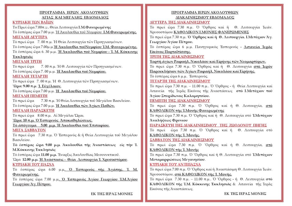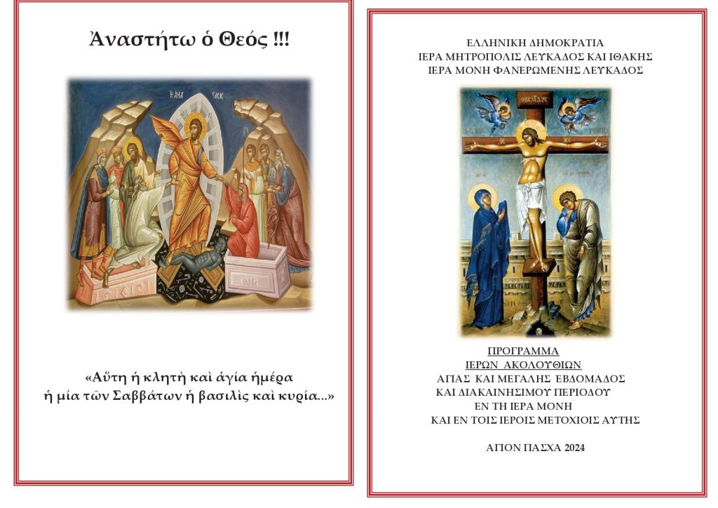 Ακολουθεί Λειτουργικό Πρόγραμμα Αγίας και Μεγάλης Εβδομάδος και Διακαινησίμου περιόδου 2024 Ιεράς Μονής Φανερωμένης Λευκάδος και των Ι. Μετοχίων αυτής.