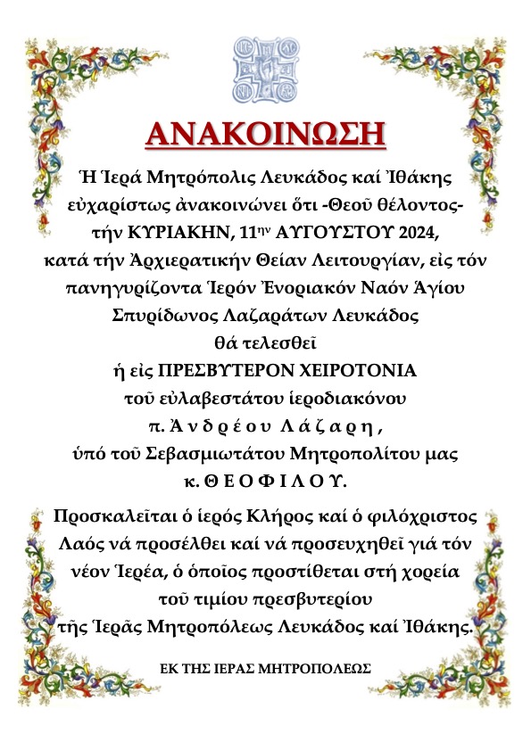 Η Ιερά Μητρόπολις Λευκάδος και Ιθάκης ευχαρίστως ανακοινώνει ότι –Θεού θέλοντος- την ΚΥΡΙΑΚΗ, 11 ΑΥΓΟΥΣΤΟΥ 2024,