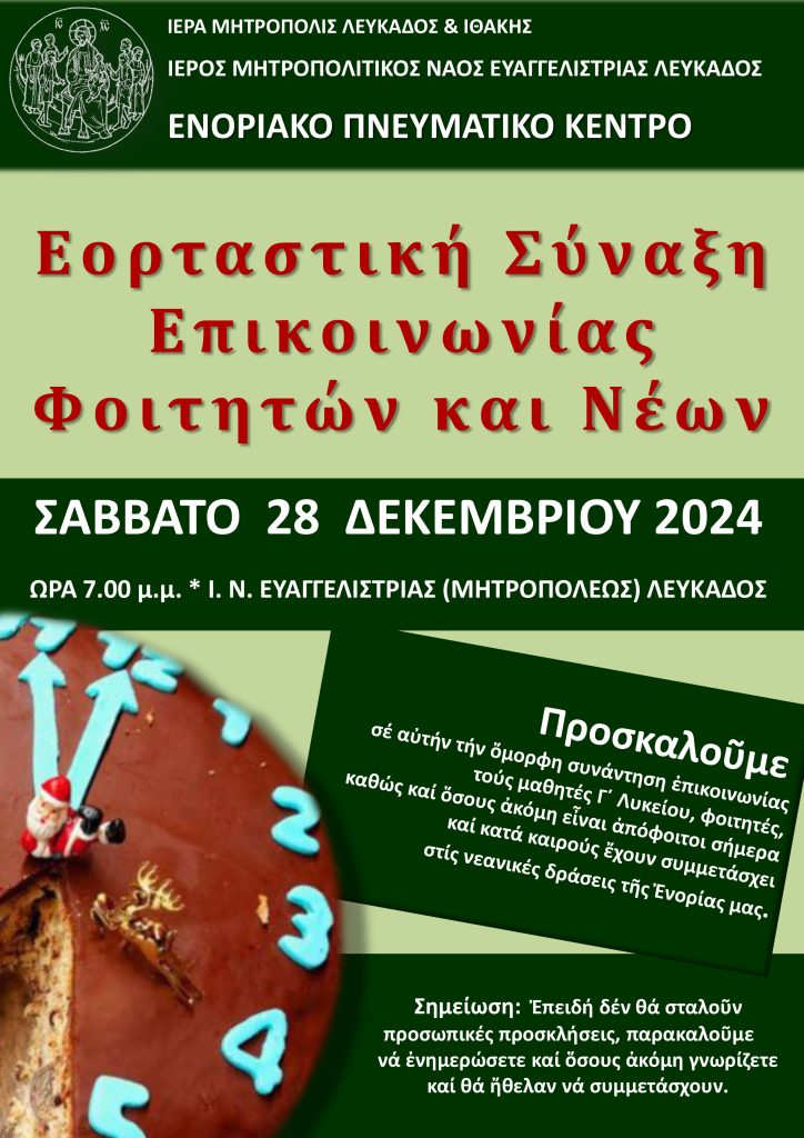 Το ερχόμενο Σάββατο, 28 Δεκεμβρίου 2024 και ώρα 7.00 μ.μ. θα πραγματοποιηθεί ξανά στον Ιερό Μητροπολιτικό Ναό Ευαγγελιστρίας Λευκάδος, παρουσία του Σεβασμιωτάτου Μητροπολίτου μας κ. Θεοφίλου, η καθιερωμένη σύναξη επικοινωνίας των φοιτητών και γενικά των νέων, που είναι απόφοιτοι σήμερα, έχουν όμως συμμετάσχει κατά καιρούς στις νεανικές δράσεις της Ενορίας της Ευαγγελιστρίας.