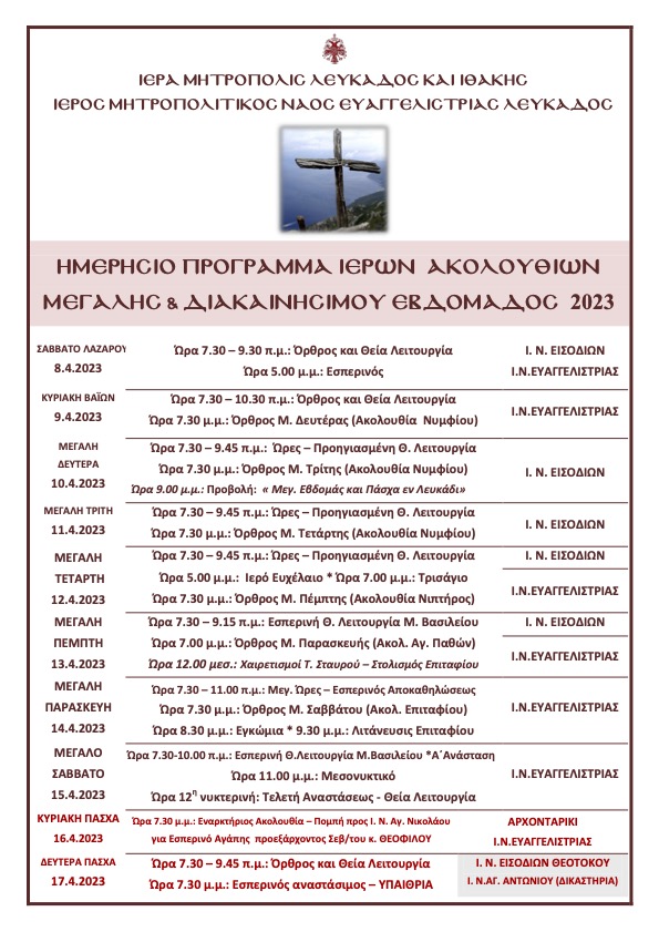 Ακολουθεί ημερήσιο Πρόγραμμα Ιερών Ακολουθιών Μεγάλης και Διακαινησίμου Εβδομάδος 2023 Ιερού Μητροπολιτικού Ναού Ευαγγελιστρίας Λευκάδος.