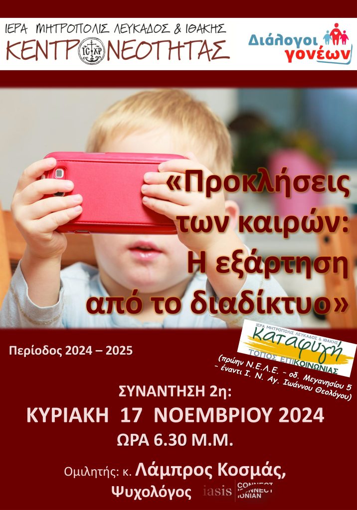 Συνεχίζοντας την φετινή τους πορεία οι «Διάλογοι Γονέων» (μια ευκαιρία συμπροβληματισμού για επίκαιρα ζητήματα γονεϊκότητας, συζυγίας και παιδαγωγικής, που διοργανώνει το Κέντρο Νεότητας της Ι. Μητροπόλεως Λευκάδος και Ιθάκης), φέρνουν στο επίκεντρο της συζήτησης την εξάρτηση από τις οθόνες και μάλιστα από το διαδίκτυο.