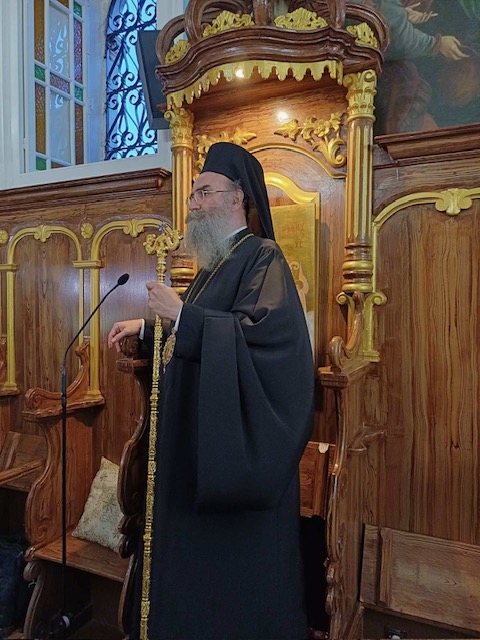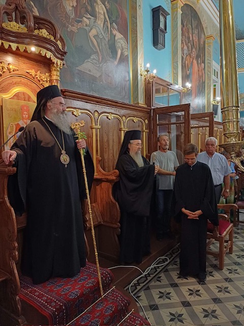 Το απόγευμα του Σαββάτου, 17 Αυγούστου και ώρα 8.00 μ.μ. εψάλη ο Μέγας Πανηγυρικός Αρχιερατικός Εσπερινός μετ’ αρτοκλασίας, χοροστατούντος του Θεοφιλεστάτου Επισκόπου Αμφιπόλεως κ. Χριστοφόρου, συγχοροστατούντος του Σεβασμιωτάτου Ποιμενάρχου μας κ. Θεοφίλου, πλαισιωμένων από πλειάδα κληρικών της Ιεράς μας Μητροπόλεως. Τον Θεοφιλέστατο υποδέχθηκε με θερμούς λόγους ο Σεβασμιώτατος Μητροπολίτης μας καλοσορίζοντάς τον στην έδρα της Ιεράς μας Μητροπόλεως και στη συνέχεια τον θείο λόγο κήρυξε ο Θεοφιλέστατος Επίσκοπος κ. Χριστοφόρος. Μετά το πέρας της Πανηγυρικής Ακολουθίας και ώρα 10.30 μ.μ. εψάλη το Μικρό Απόδειπνο και στη συνέχεια η Ακολουθία των Χαιρετισμών προς τους εν Λευκάδι Αγίους.