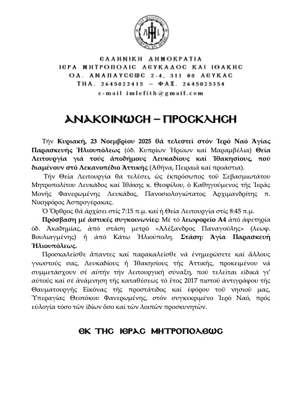 Τήν Κυριακή, 23 Νοεμβρίου 2025 θά τελεστεῖ στόν Ἱερό Ναό Ἁγίας Παρασκευῆς Ἡλιουπόλεως (ὁδ. Κυπρίων Ἡρώων καί Μαραμβέλια) Θεία Λειτουργία γιά τούς ἀποδήμους Λευκαδίους καί Ἰθακησίους, πού διαμένουν στό Λεκανοπέδιο Ἀττικῆς (Ἀθήνα, Πειραιᾶ καί προάστια).