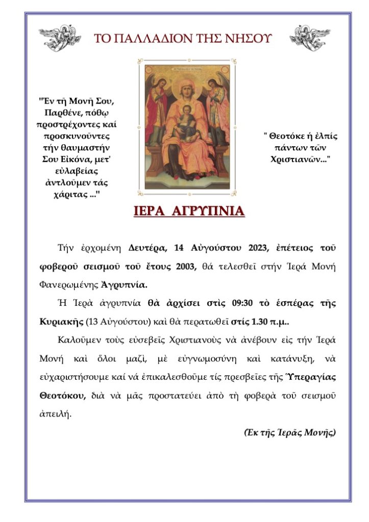 Τήν ἐρχομένη Δευτέρα, 14 Αὐγούστου 2023, ἐπέτειος τοῦ φοβεροῦ σεισμοῦ τοῦ ἔτους 2003, θά τελεσθεῖ στήν Ἱερά Μονή Φανερωμένης Ἀγρυπνία.