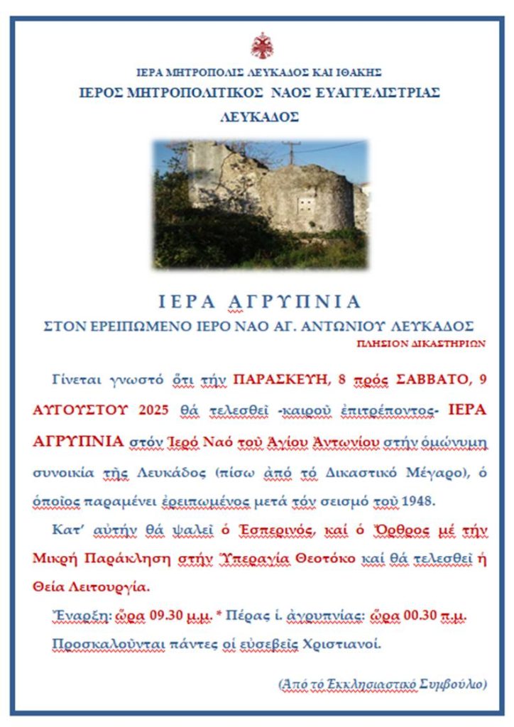 Γίνεται γνωστό ὅτι τήν ΠΑΡΑΣΚΕΥΗ, 8 πρός ΣΑΒΒΑΤΟ, 9 ΑΥΓΟΥΣΤΟΥ 2025 θά τελεσθεῖ -καιροῦ ἐπιτρέποντος- ΙΕΡΑ ΑΓΡΥΠΝΙΑ στόν Ἱερό Ναό τοῦ Ἁγίου Ἀντωνίου στήν ὁμώνυμη συνοικία τῆς Λευκάδος (πίσω ἀπό τό Δικαστικό Μέγαρο), ὁ ὁποῖος παραμένει ἐρειπωμένος μετά τόν σεισμό τοῦ 1948.