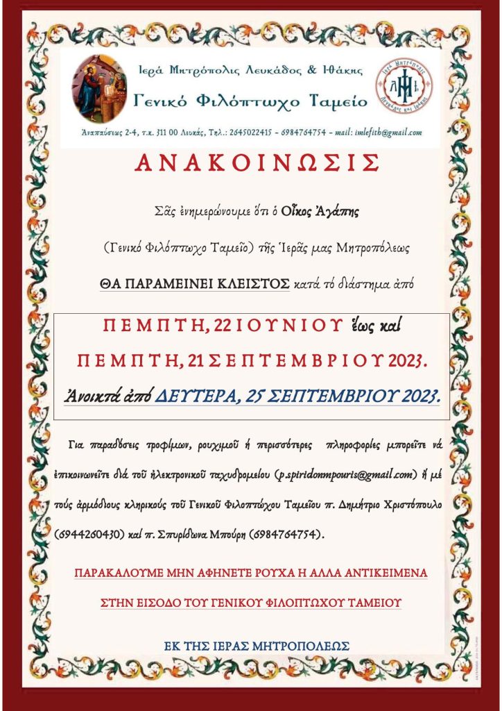 Σᾶς ἐνημερώνουμε ὅτι ὁ Οἶκος Ἀγάπης