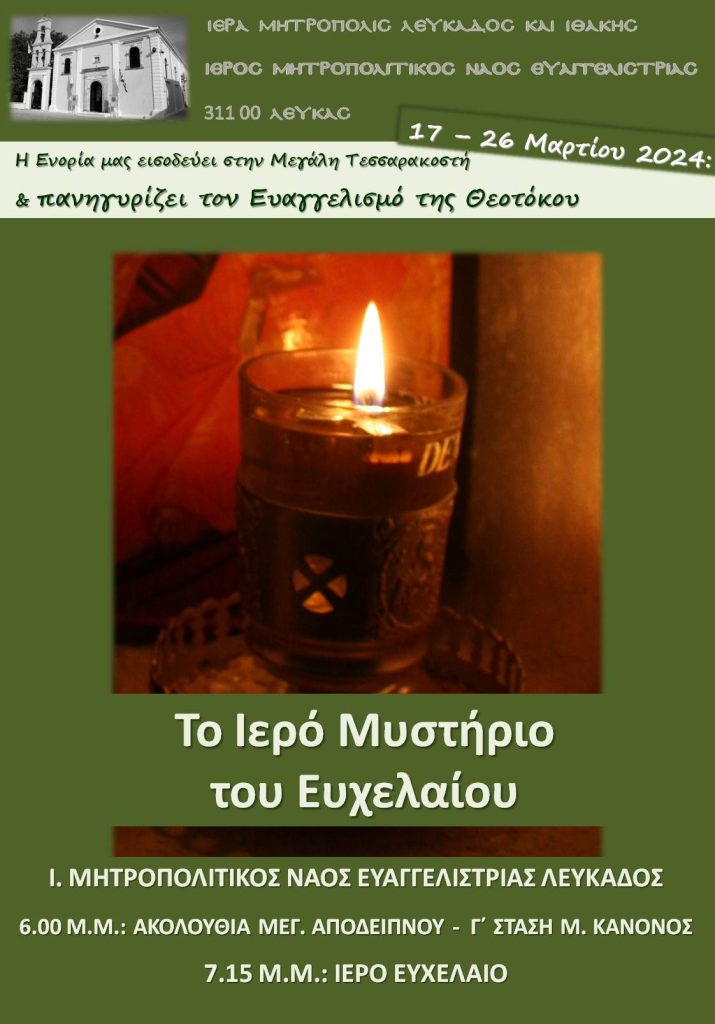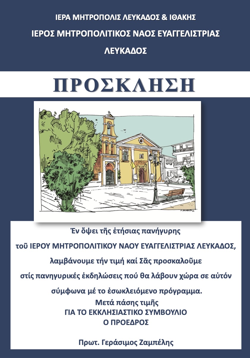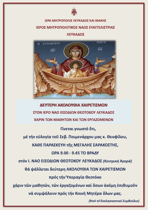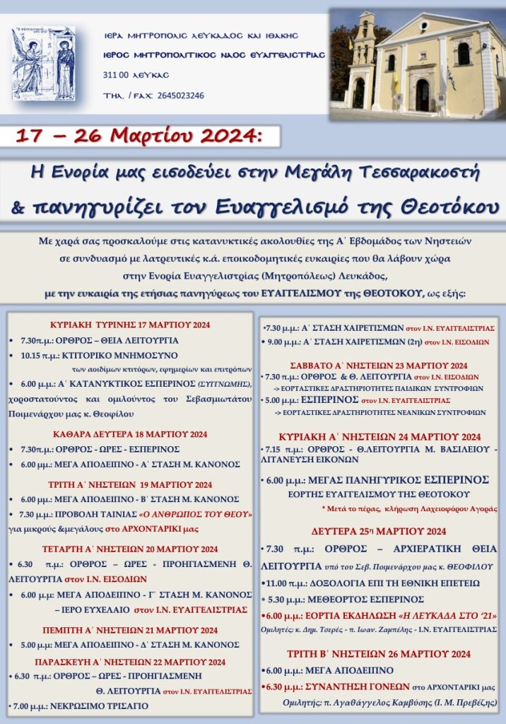 Με χαρά σας προσκαλούμε στις κατανυκτικές ακολουθίες της Α΄ Εβδομάδος των Νηστειών σε συνδυασμό με λατρευτικές κ.ά. εποικοδομητικές ευκαιρίες που θα λάβουν χώρα στην Ενορία Ευαγγελιστρίας (Μητροπόλεως) Λευκάδος,