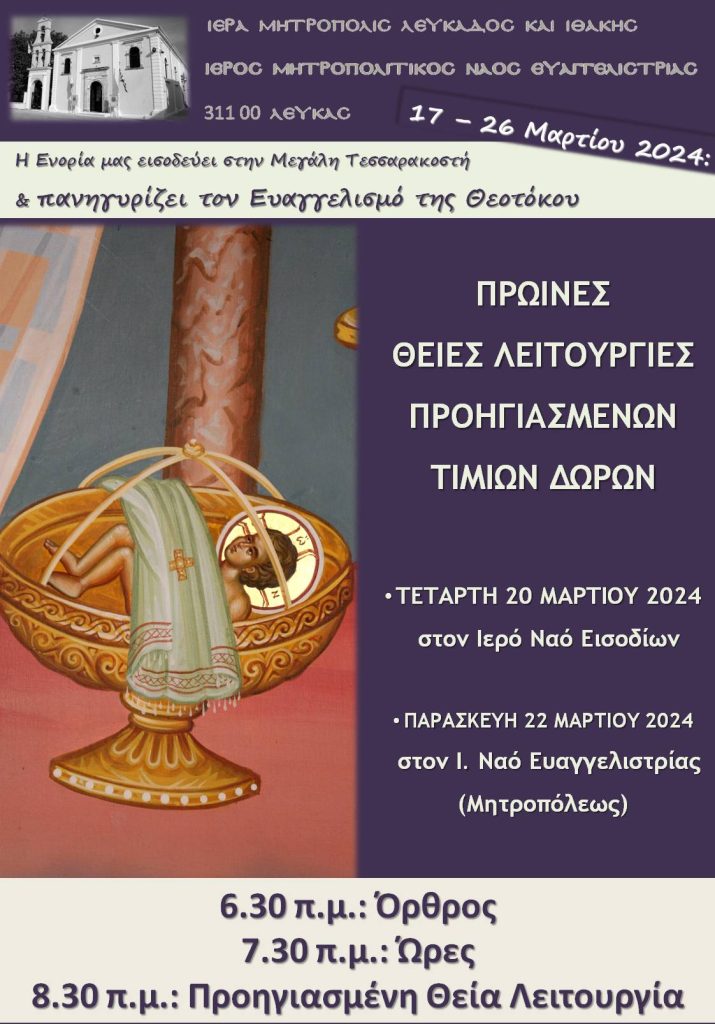 6.30 π.μ.: ΟΡΘΡΟΣ – ΩΡΕΣ – ΠΡΟΗΓΙΑΣΜΕΝΗ Θ. ΛΕΙΤΟΥΡΓΙΑ στον Ι.Ν. ΕΥΑΓΓΕΛΙΣΤΡΙΑΣ