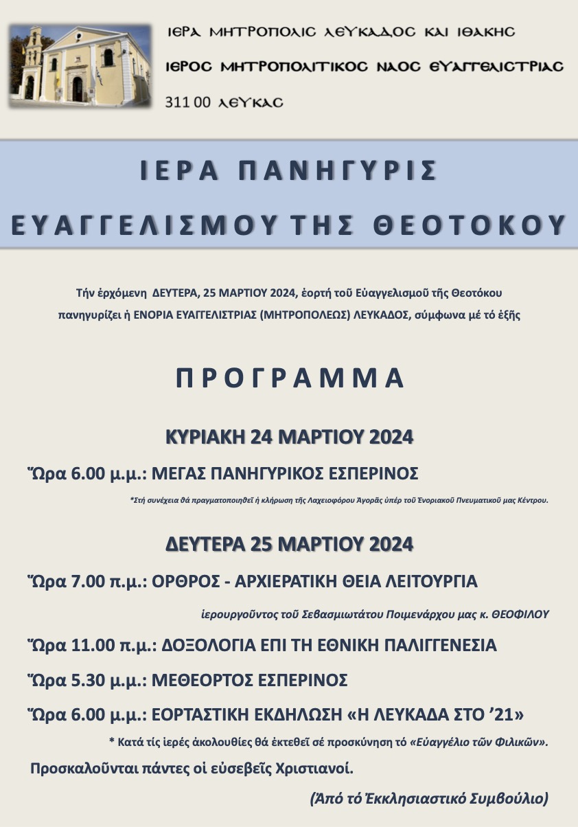 με την ευκαιρία της ετήσιας πανηγύρεως του ΕΥΑΓΓΕΛΙΣΜΟΥ της ΘΕΟΤΟΚΟΥ, ως εξής: