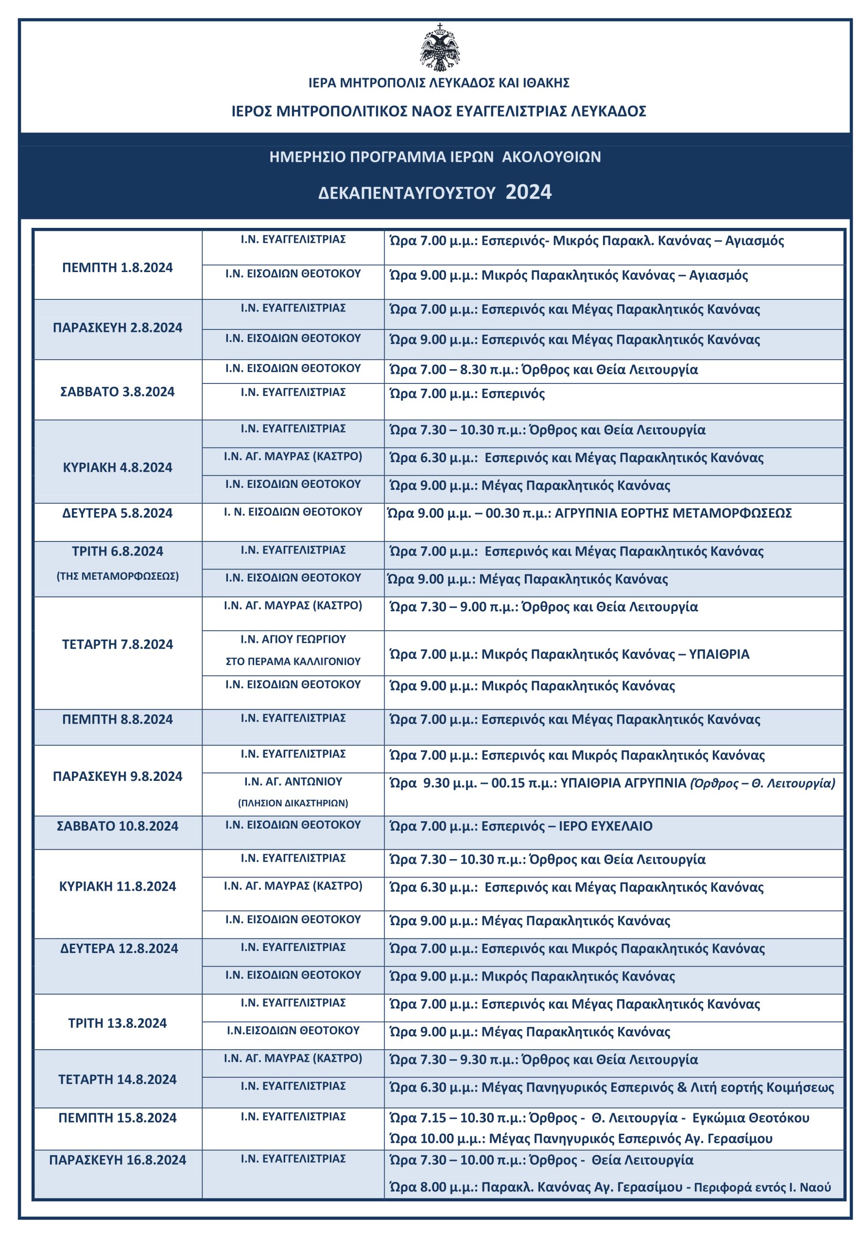 Ακολουθεί Λειτουργικό πρόγραμμα περιόδου 15Αυγούστου 2024 Ιερού Μητροπολιτικού Ναού Ευαγγελιστρίας Λευκάδος.