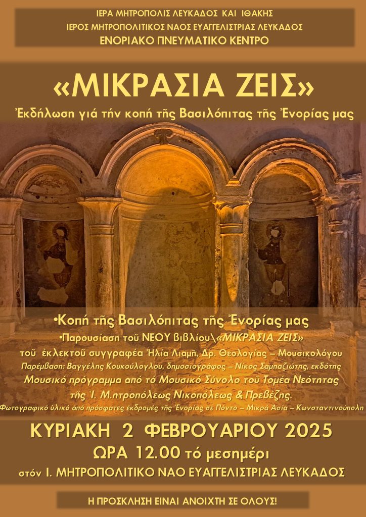 Την ερχόμενη Κυριακή, 2 Φεβρουαρίου 2025, εορτή της Υπαπαντής του Κυρίου, στις 12.00 το μεσημέρι, στον Ιερό Μητροπολιτικό Ναό Ευαγγελιστρίας Λευκάδος θα πραγματοποιηθεί, με την ευλογία του Σεβασμιωτάτου Ποιμενάρχου μας κ. Θεοφίλου, Εορταστική Εκδήλωση με τίτλο: «ΜΙΚΡΑΣΙΑ ΖΕΙΣ» με αφορμή την Κοπή της Βασιλόπιτας της Ενορίας της Ευαγγελιστρίας.
