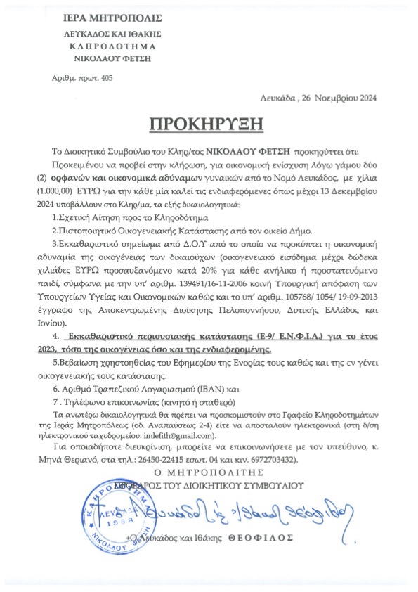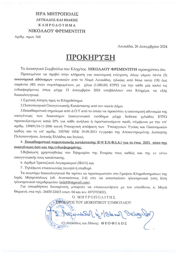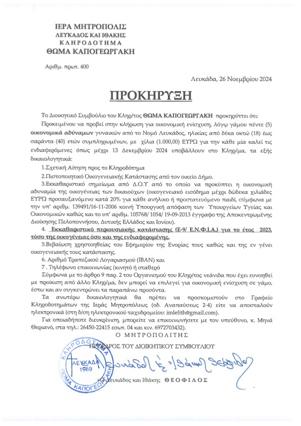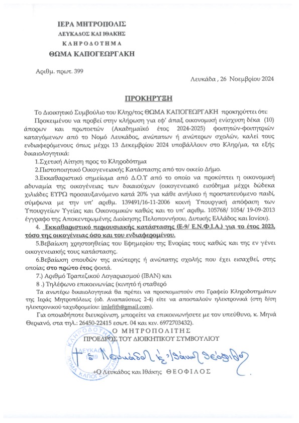 ‘Ακολουθούν Προκηρύξεις τῶν Κληροδοτημάτων: α) Θωμᾶ Καπογεωργάκη, περί ἐνισχύσεως ἀπόρων καί πρωτοετῶν φοιτητῶν-φοιτητριῶν, β) Νικολάου Φέτση, περί ἐνισχύσεως ὀρφανῶν καί οἰκονομικά ἀδύναμων γυναικῶν, γ) Θωμᾶ Καπογεωργάκη καί δ) Νικολάου Φρεμεντίτη.