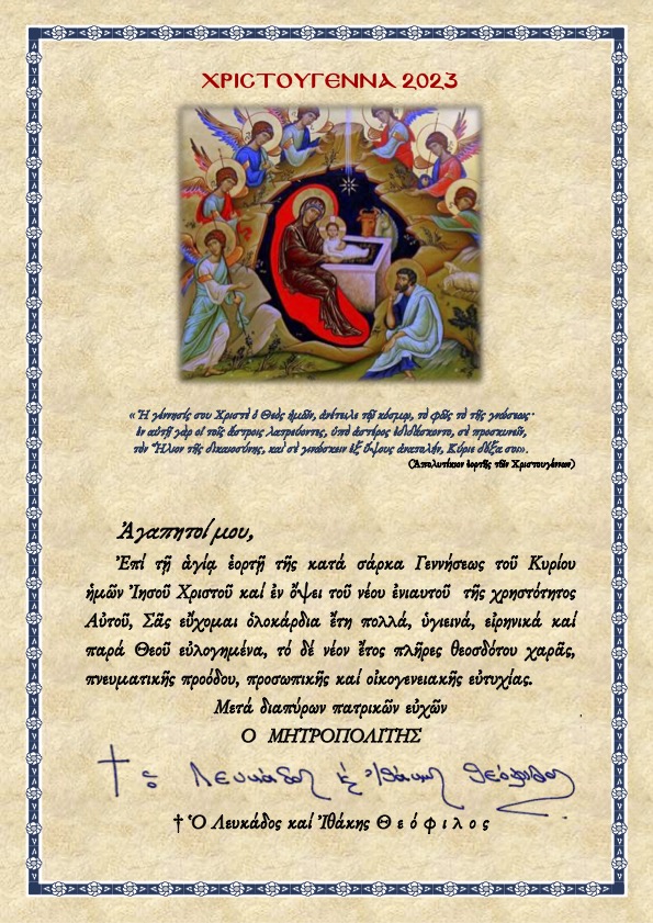 Εν όψει των Χριστουγέννων και της ελεύσεως του νέου έτους 2024, δεν θα αποστείλει ιδιαίτερες προσωπικές επιστολές με τις ευχές του, μέσω των Ελληνικών Ταχυδρομείων, ως είθισται, παρά μόνο διά του ηλεκτρονικού ταχυδρομείου. Εύχεται όμως ολόψυχα σε όλους κάθε ευλογία και προκοπή με τη συνημμένη κάρτα.