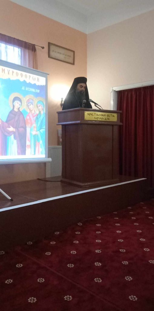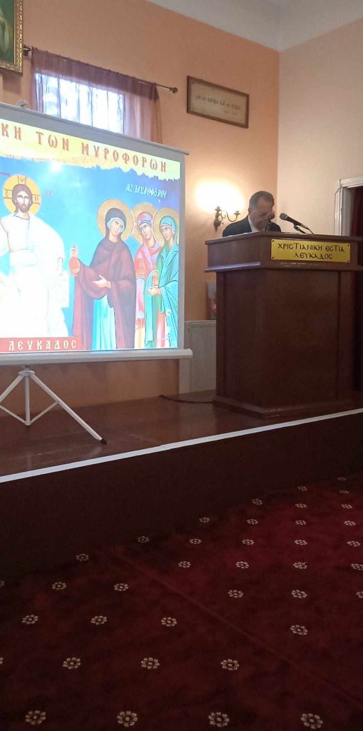 Την Κυριακή των Μυροφόρων, 19 Μαΐου 2024 και ώρα 7.00 μ.μ. πραγματοποιήθηκε στην αίθουσα της ΓΕΧΑ Λευκάδος (όπισθεν του Ι. Ναού Παντοκράτορος), με την ευλογία του Σεβασμιωτάτου Ποιμενάρχου μας κ. Θεοφίλου, παρουσίαση οπτικοακουστικού υλικού αναφερόμενο στις μορφές των Αγίων Μυροφόρων και στη συνέχεια η τελευταία ομιλία για το τρέχον έτος, με ομιλητή τον Πανοσιολογιώτατο Αρχιμανδρίτη π. Σπυρίδωνα Μπούρη, Αρχιερατικό Επίτροπο Λευκάδος και θέμα: ¨«…Ἰησοῦν ζητεῖτε τὸν Ναζαρηνὸν τὸν ἐσταυρωμένον{ ἠγέρθη, οὐκ ἔστιν ὦδε…» (Μάρκ. ιστ ́, 6)¨ .