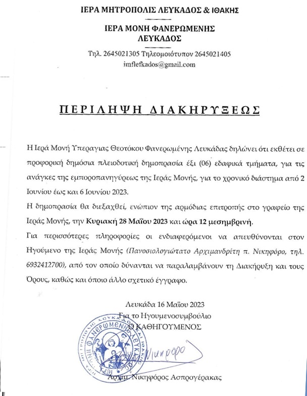 Περίληψη Διακηρύξεως Ιεράς Μονής Υπεραγίας Θεοτόκου Φανερωμένης Λευκάδος.