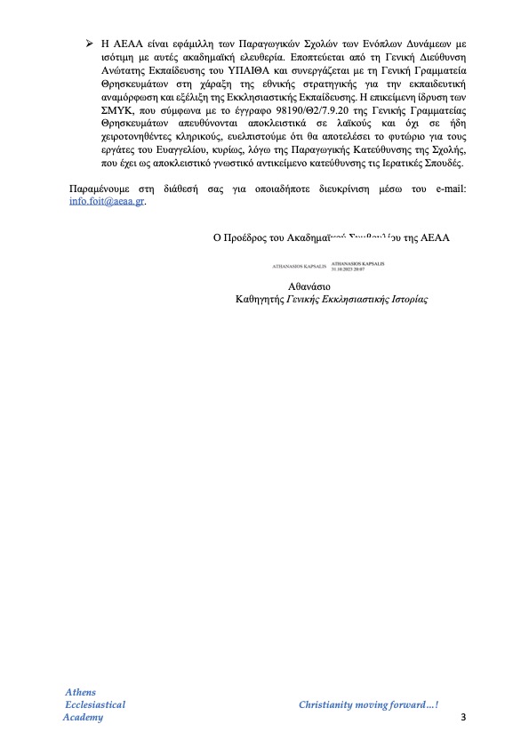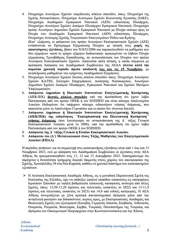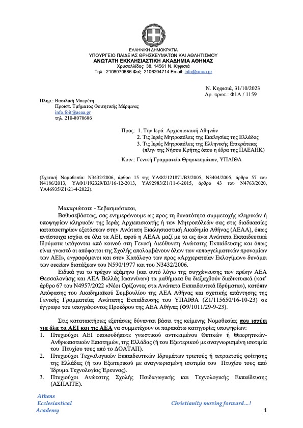Ακολουθεί έγγραφο του Ακαδημαϊκού Συμβουλίου της Ανωτάτης Εκκλησιαστικής Ακαδημίας Αθηνών (Α.Ε.Α.Α.) περί της συμμετοχής κληρικών ή υποψηφίων κληρικών στις διαδικάσιες κατατακτηρίων εξετάσεων.