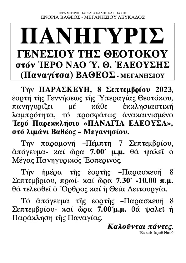 Ακολουθούν προγράμματα εορτασμού Ιερών Παρεκκλησίων Αγίου Νεκταρίου και ¨Παναγίας Ελεούσας¨ λιμένος Βαθέος Μεγανησίου.