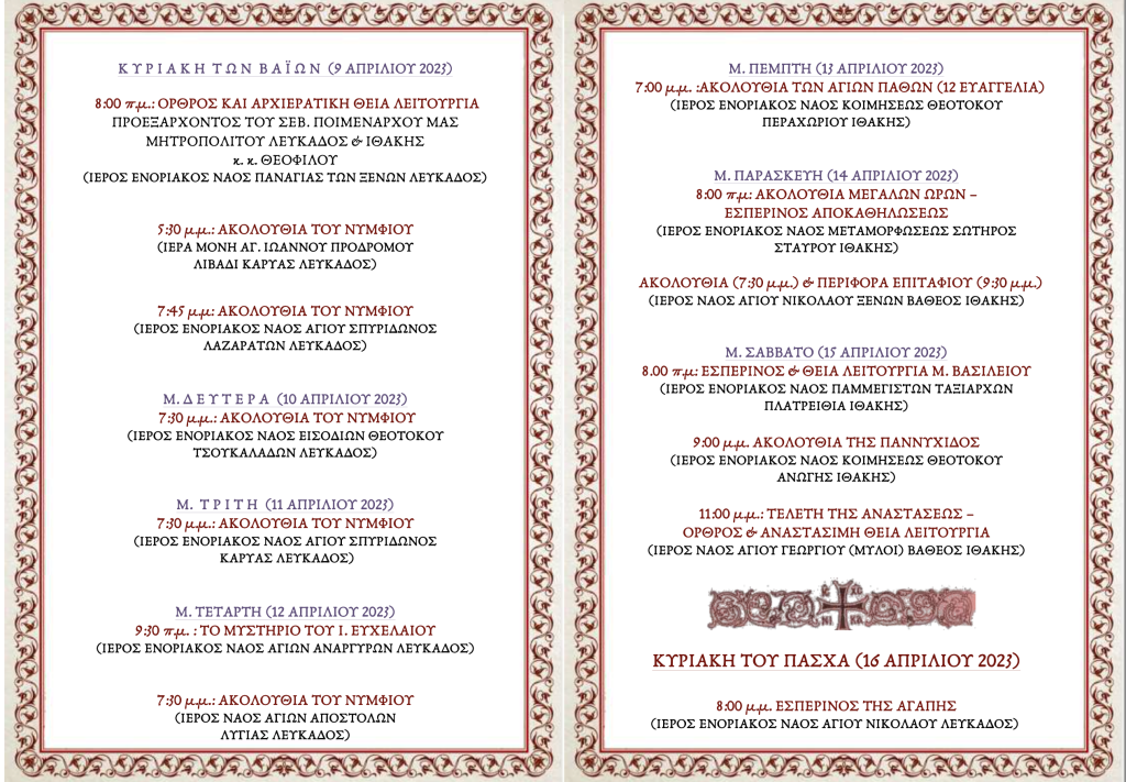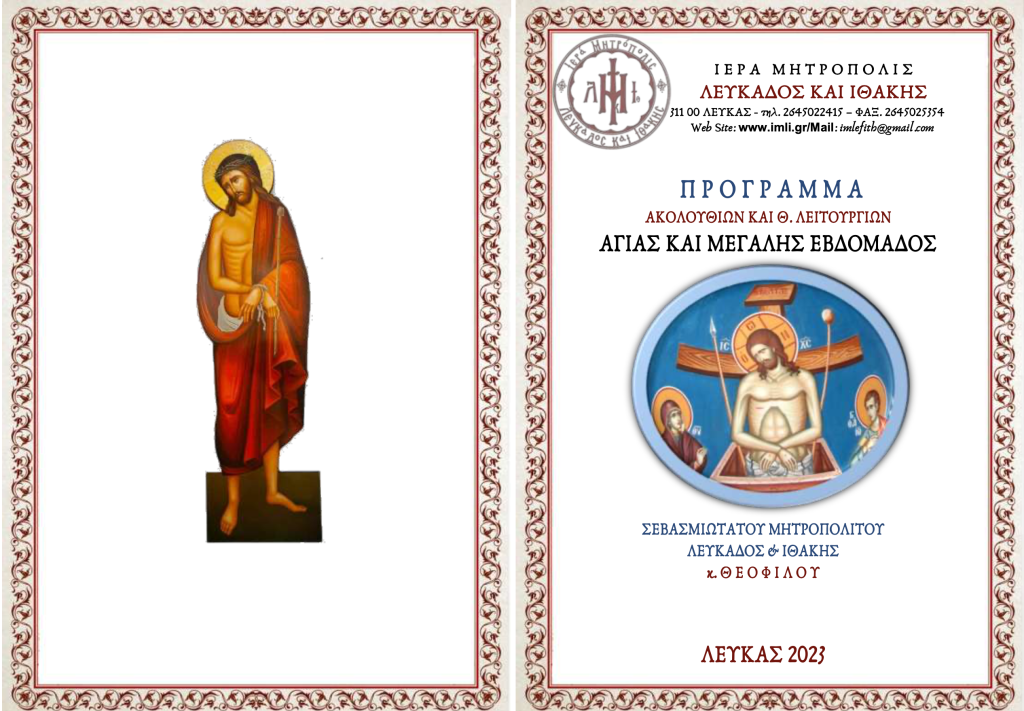 Ακολουθεί πρόγραμμα Ιερών Ακολουθιών και Θείων Λειτουργιών Αγίας και Μ. Εβδομάδος 2023 Σεβασμιωτάτου Μητροπολίτου Λευκάδος και Ιθάκης κ. Θεοφίλου.