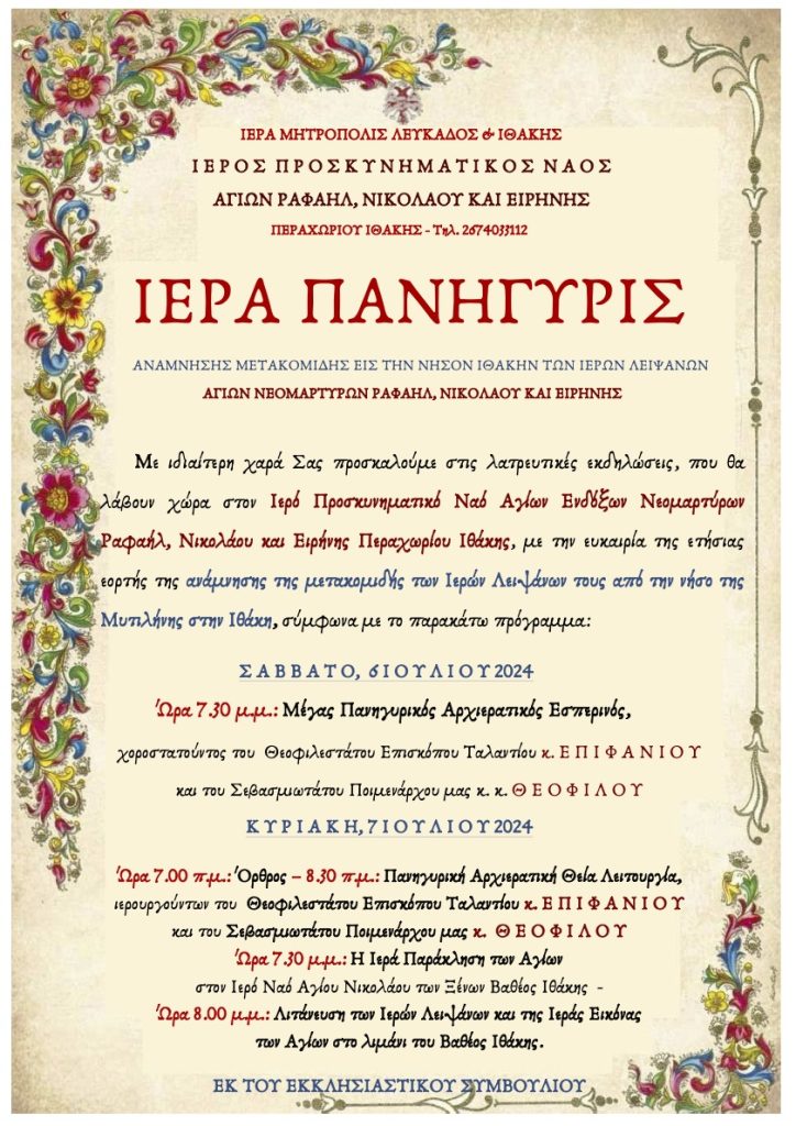 Ακολουθεί Πρόγραμμα – πρόσκληση εορτασμού μετακομιδής Ιερών Λειψάνων Νεομαρτύρων Αγίων Ραφαήλ, Νικολάου και Ειρήνης στον ομώνυμο Προσκυνηματικό Ναό στο Περαχώρι Ιθάκης.