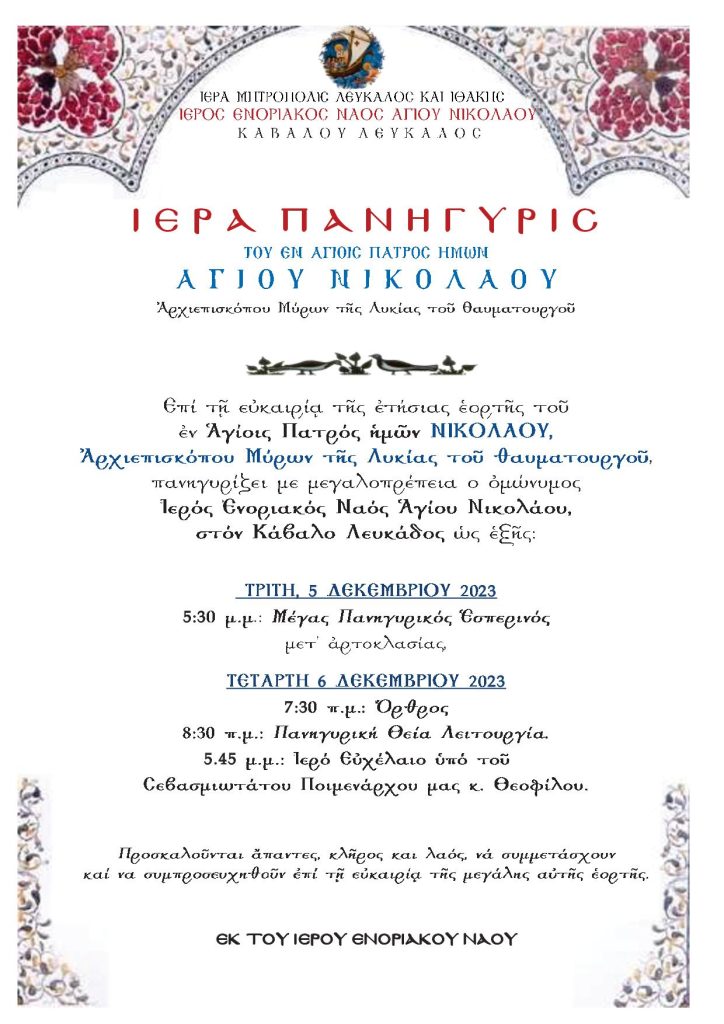 Ἐπί τῇ εὐκαιρίᾳ τῆς ἐτήσιας ἑορτῆς τοῦ ἐν Ἁγίοις Πατρός ἡμῶν ΝΙΚΟΛΑΟΥ, Ἀρχιεπισκόπου Μύρων τῆς Λυκίας τοῦ θαυματουργοῦ, πανηγυρίζει με μεγαλοπρέπεια ο ὀμώνυμος