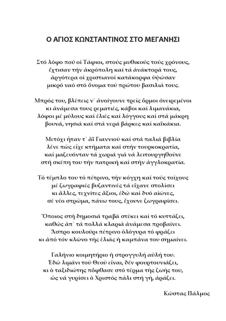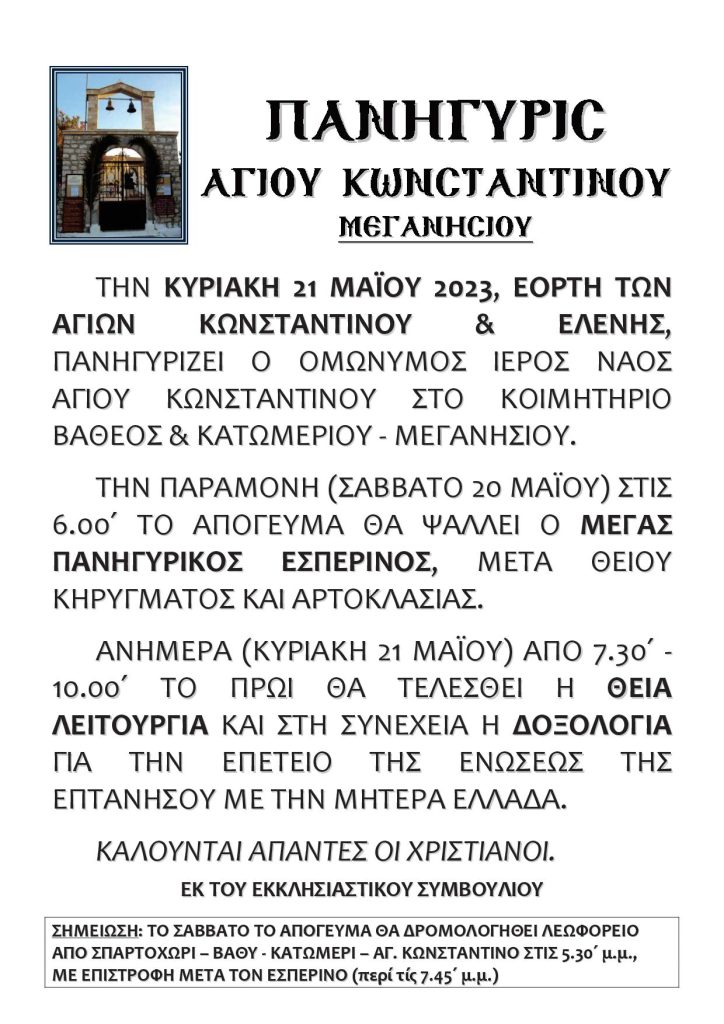 Ακολουθεί πρόγραμμα Ιεράς Πανηγύρεως Ιερού Κοιμητηριακού Ναού Αγίου Κωνσταντίνου και Ελένης Βαθέος Κατωμέριου Μεγανησίου.