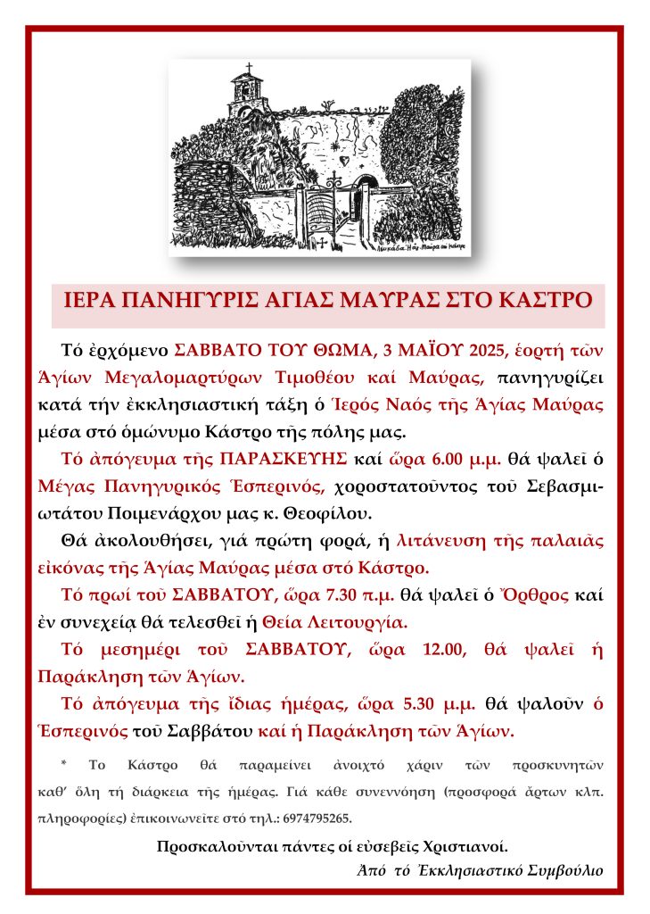 Τό ἐρχόμενο ΣΑΒΒΑΤΟ ΤΟΥ ΘΩΜΑ, 3 ΜΑΪΟΥ 2025, ἑορτή τῶν Ἁγίων Μεγαλομαρτύρων Τιμοθέου καί Μαύρας, πανηγυρίζει κατά τήν ἐκκλησιαστική τάξη ὁ Ἱερός Ναός τῆς Ἁγίας Μαύρας μέσα στό ὁμώνυμο Κάστρο τῆς πόλης μας.