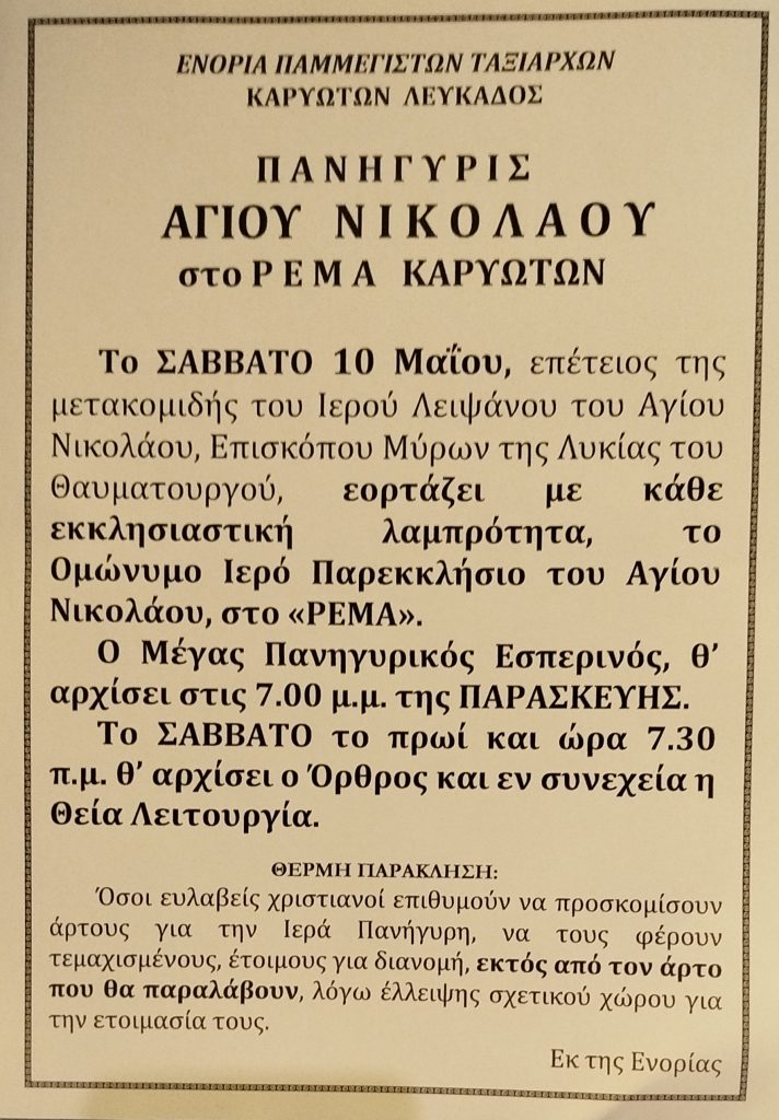 Ακολουθεί πρόγραμμα Ιεράς Πανηγύρεως Ιερού Παρεκκλησίου Αγίου Νικολάου στο ¨Ρέμα¨ Καρυωτών Λευκάδος.