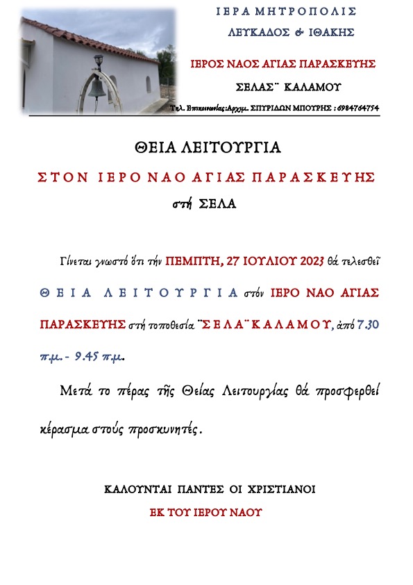 Ακολουθεί πρόγραμμα Ιεράς Πανηγύρεως Ιερών Ναών Αγίας Παρασκευής ¨Αγραπιδιάς¨ και ¨Σέλας¨ Καλάμου.