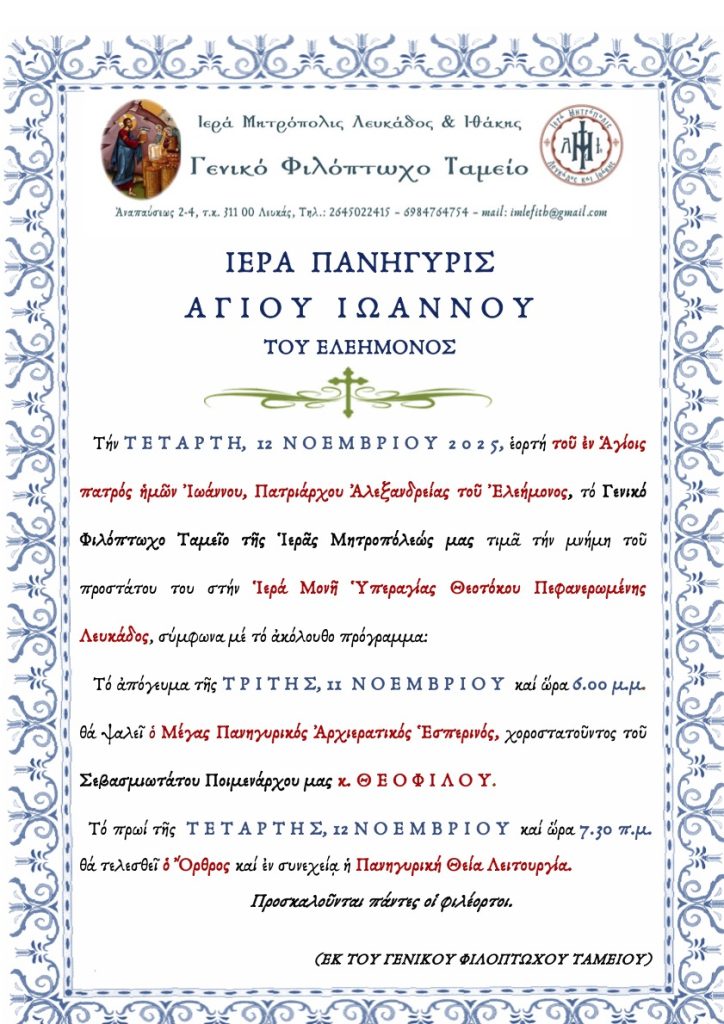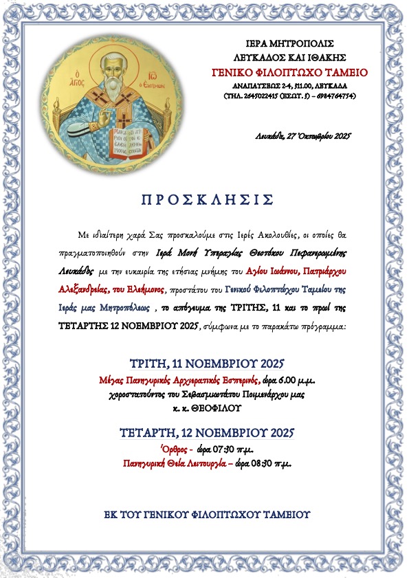 Τήν Τ Ε Τ Α Ρ Τ Η, 12 Ν Ο Ε Μ Β Ρ Ι Ο Υ 2 0 2 5, ἑορτή τοῦ ἐν Ἁγίοις πατρός ἡμῶν Ἰωάννου, Πατριάρχου Ἀλεξανδρείας τοῦ Ἐλεήμονος, τό Γενικό Φιλόπτωχο Ταμεῖο τῆς Ἱερᾶς Μητροπόλεώς μας τιμᾶ τήν μνήμη τοῦ προστάτου του στήν Ἱερά Μονῆ Ὑπεραγίας Θεοτόκου Πεφανερωμένης Λευκάδος, σύμφωνα μέ τό ἀκόλουθο πρόγραμμα:
