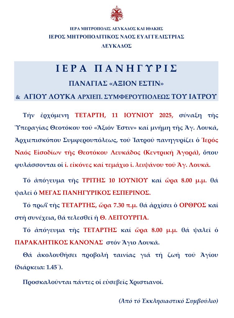Τήν ἐρχόμενη ΤΕΤΑΡΤΗ, 11 ΙΟΥΝΙΟΥ 2025, σύναξη τῆς Ὑπεραγίας Θεοτόκου τοῦ «Ἄξιόν Ἐστιν» καί μνήμη τῆς Ἁγ. Λουκᾶ, Ἀρχιεπισκόπου Συμφερουπόλεως, τοῦ Ἰατροῦ πανηγυρίζει ὁ Ἱερός Ναός Εἰσοδίων τῆς Θεοτόκου Λευκάδος (Κεντρική Ἀγορά), ὅπου φυλάσσονται οἱ ἱ. εἰκόνες καί τεμάχιο ἱ. λειψάνου τοῦ Ἁγ. Λουκᾶ.