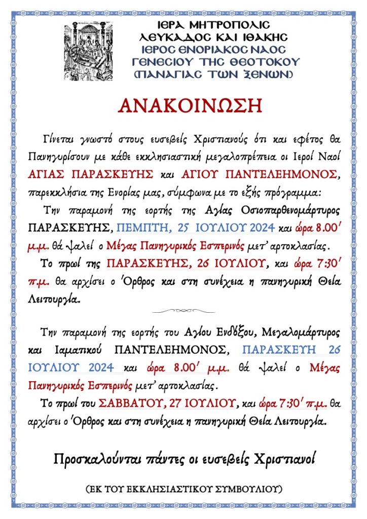 Γίνεται γνωστό στους ευσεβείς Χριστιανούς ότι και εφέτος θα Πανηγυρίσουν με κάθε εκκλησιαστική μεγαλοπρέπεια οι Ιεροί Ναοί ΑΓΙΑΣ ΠΑΡΑΣΚΕΥΗΣ και ΑΓΙΟΥ ΠΑΝΤΕΛΕΗΜΟΝΟΣ, παρεκκλήσια της Ενορίας μας, σύμφωνα με το εξής πρόγραμμα: