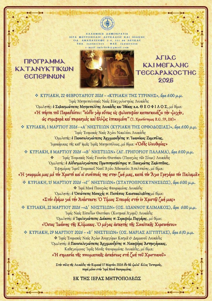 Ακολουθεί πρόγραμμα Κατανυκτικών Εσπερινών Αγίας και Μεγάλης Τεσσαρακοστής 2026.