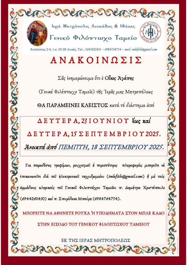 Ακολουθεί πρόγραμμα λειτουργίας Οίκου Αγάπης Γενικού Φιλοπτώχου Ταμείου Ιεράς Μητροπόλεως κατά τους θερινούς μήνες 2025.