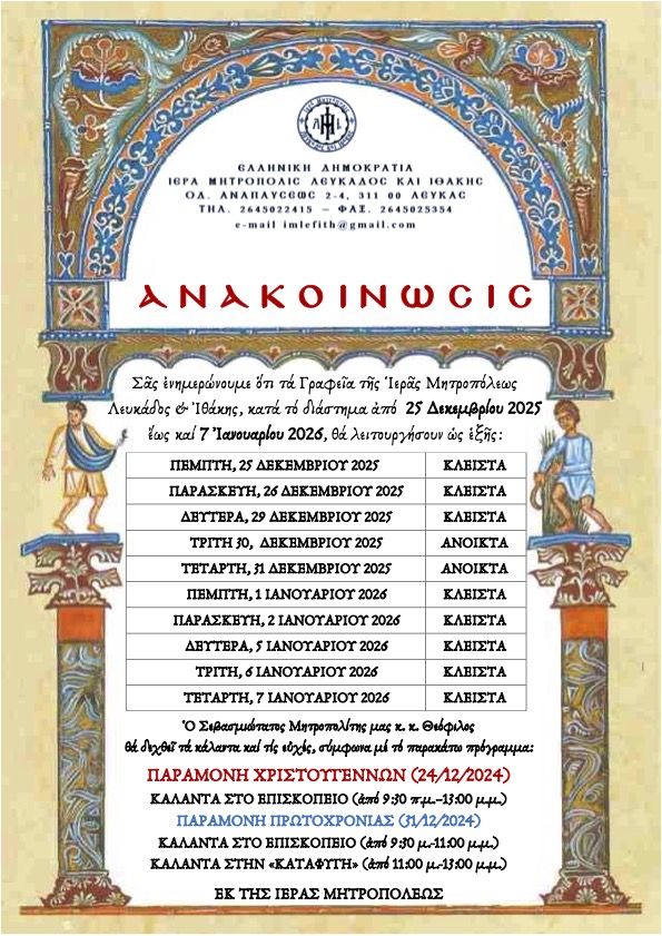 Ακολουθεί πρόγραμμα λειτουργίας Υπηρεσίων Ιεράς Μητροπόλεως Λευκάδος και Ιθάκης Αγίου Δωδεκαημέρου 2025 – 2026.