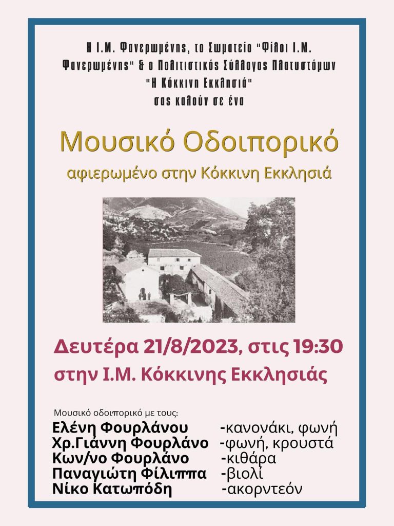 Ακολουθεί πρόγραμμα Μουσικού Οδοιπορικού αφιερωμένο στην Ι. Μονή Κόκκινης Εκκλησιάς Πλατυστόμων, Ιερού Μετοχίου Ιεράς Μονής Υπεραγίας Θεοτόκου Φανερωμένης Λευκάδος.