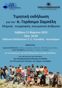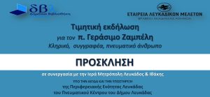 Η Εταιρεία Λευκαδικών Μελετών και η Δημόσια Βιβλιοθήκη Λευκάδας, εκτιμώντας την ποιμαντική προσφορά και το πολύπλευρο έργο του Αιδεσιμολογιώτατου Πρωτοπρεσβύτερου π. Γεράσιμου Ζαμπέλη, κληρικού, συγγραφέα, πνευματικού ανθρώπου, συνδιοργανώνουν εκδήλωση προς τιμήν του, το Σάββατο 11 Μαρτίου 2023 και ώρα 18.00΄, στην Αίθουσα της Περιφερειακής Ενότητας Λευκάδας, στο Διοικητήριο.