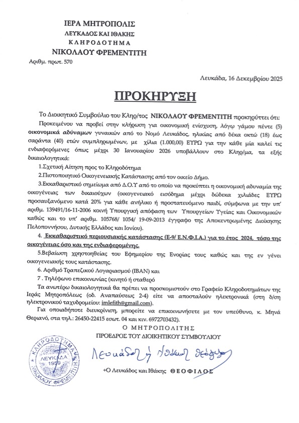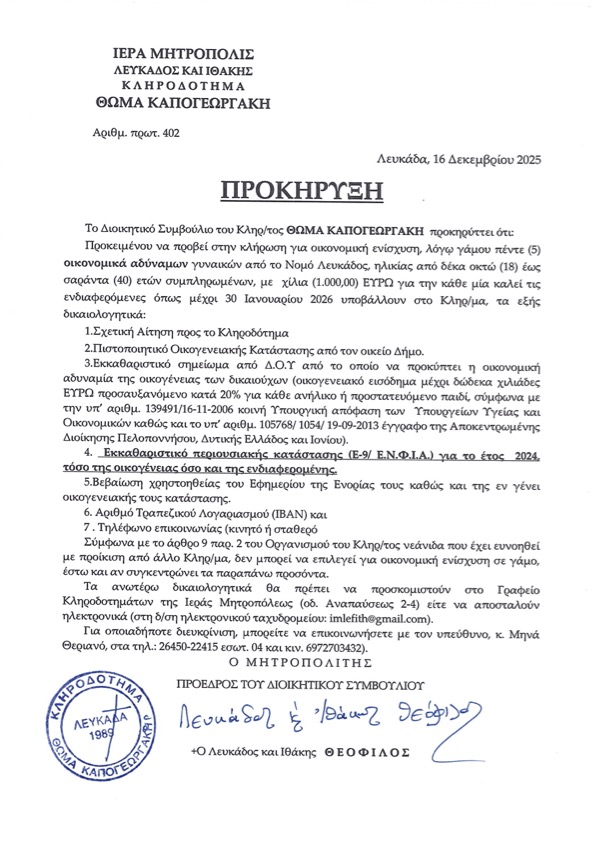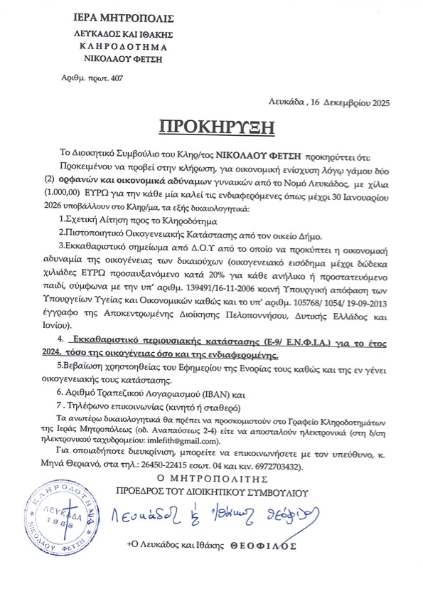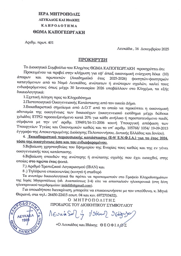 Ακολουθούν οι Προκηρύξεις των Κληροδοτημάτων της Ιεράς μας Μητροπόλεως.