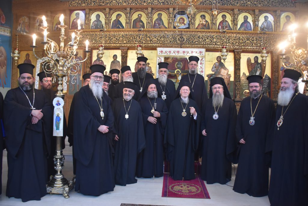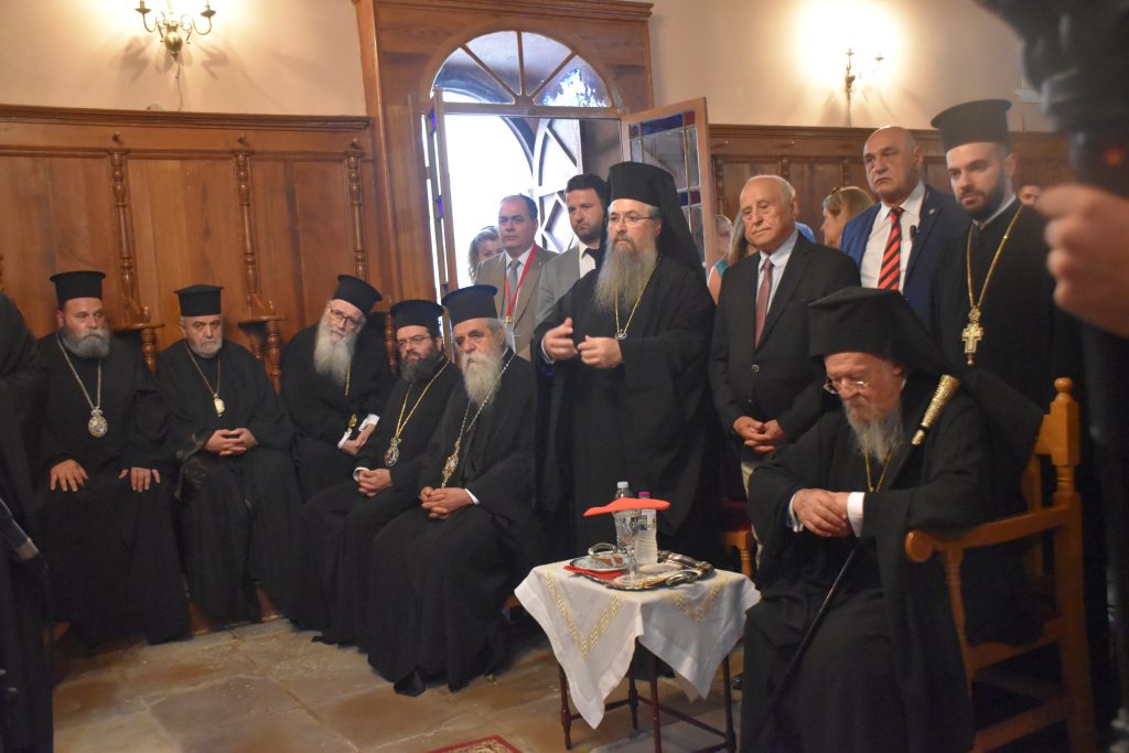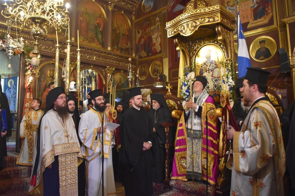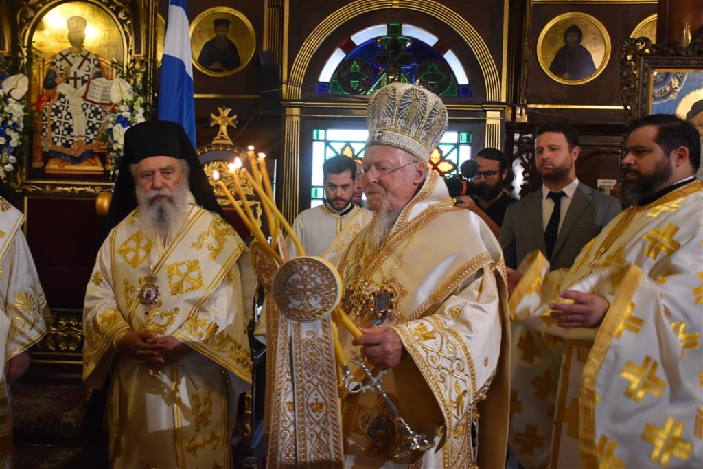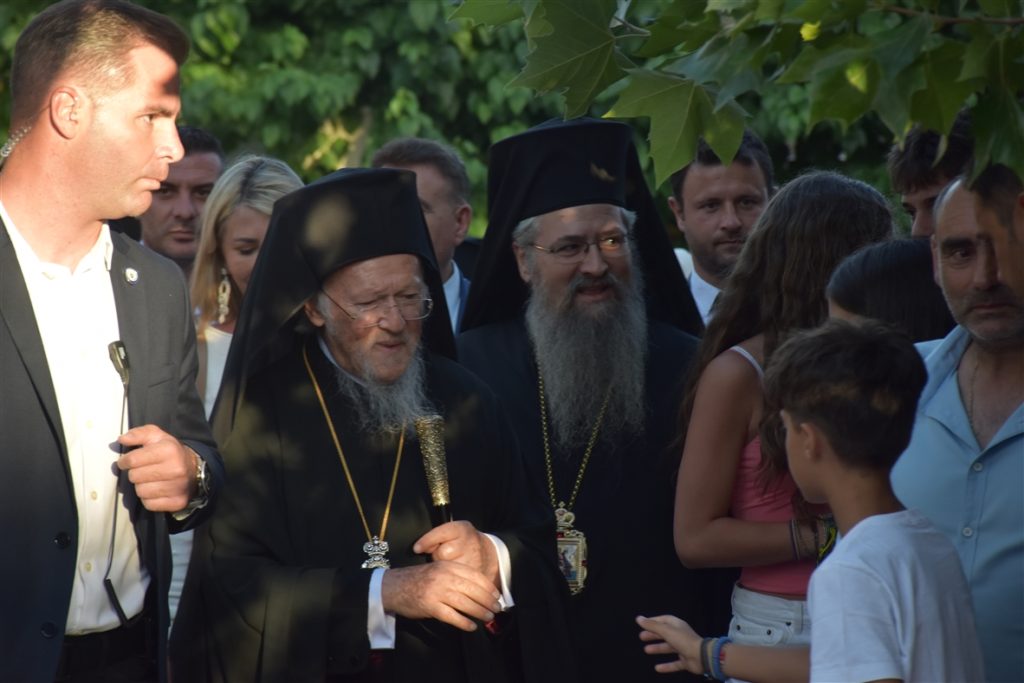 Την συνοδεία του Παναγιωτάτου απάρτιζαν: ο Σεβασμιώτατος Μητροπολίτης Γέρων Δέρκων  κ.κ. Απόστολος, ο Σεβασμιώτατος Μητροπολίτης Προικοννήσου κ.κ. Ιωσήφ, ο Σεβασμιώτατος Μητροπολίτης Μαρωνείας καί Κομοτηνής κ.κ. Παντελεήμων, ο Λευκάδιος στην καταγωγή Πανοσιολογιώτατος Ἀρχιμανδρίτης π. Βοσπόριος Μαγκαφάς, Αρχιγραμματέας της Αγίας και Ιεράς Συνόδου του Οικουμενικού Πατριαρχείου, ὁ Πανοσιολογιώτατος Ἀρχιμανδρίτης π. Αέτιος, Μέγας Εκκλησιάρχης και Διευθυντής του Ιδιαιτέρου Πατριαρχικού Γραφείου, ο Δευτερεύων των Πατριαρχικών Διακόνων π. Καλλίνικος και ο Πατριαρχικός Διάκονος π. Ευλόγιος και μέλη της Πατριαρχικής Αυλής. Παρόν μεταξύ άλλων και ο φιλοξενούμενος της Ιεράς μας Μητροπόλεως, ο Κοσμήτωρ της Θεολογικής Σχολής του Εθνικού και Καποδιστριακού Πανεπιστημίου Αθηνών (Ε.Κ.Π.Α.) και Καθηγητής του Τμήματος Κοινωνικής Θεολογίας & Θρησκειολογίας του Ε.Κ.Π.Α. κ. Εμμανουήλ Καραγεωργούδης.