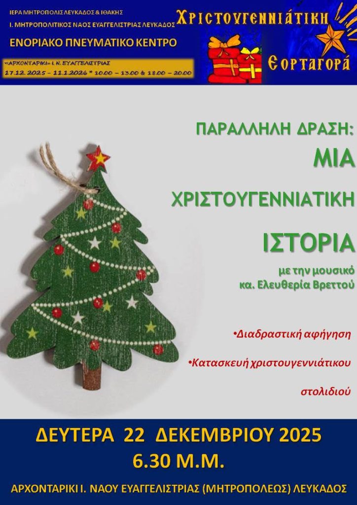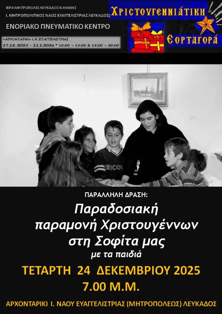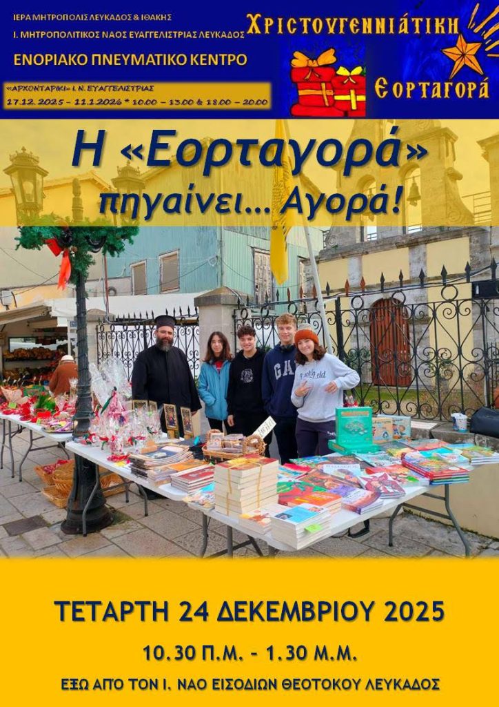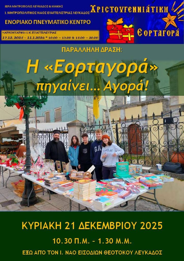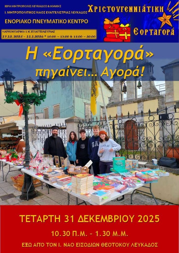 Από την ερχόμενη Τετάρτη, 17 Δεκεμβρίου 2025 και μέχρι το τέλος των γιορτών του Αγίου Δωδεκαημέρου θα λειτουργήσει και φέτος στο «Αρχονταρίκι» του Ι. Ναού της Ευαγγελιστρίας (Μητροπόλεως), πίσω από το Ιερό της Εκκλησίας, η καθιερωμένη πια «Χριστουγεννιάτικη Εορταγορά» για την ενίσχυση των νεανικών δράσεων του Πνευματικού Κέντρου της Ενορίας.