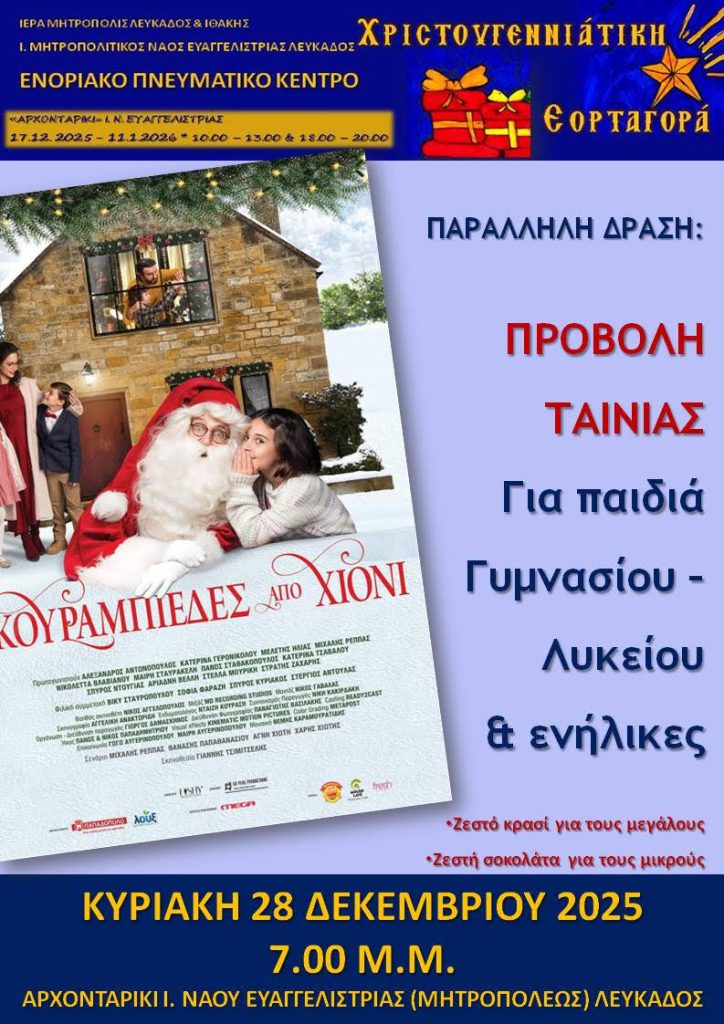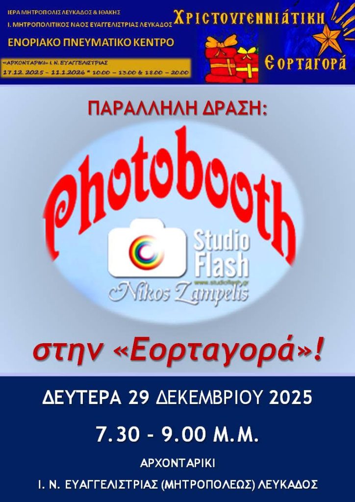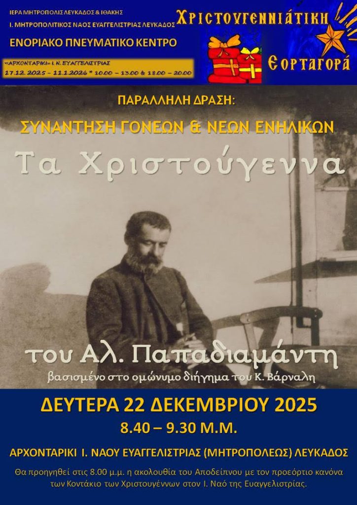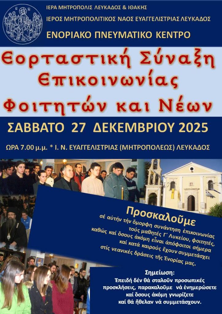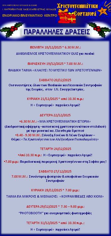 Από την ερχόμενη Τετάρτη, 17 Δεκεμβρίου 2025 και μέχρι το τέλος των γιορτών του Αγίου Δωδεκαημέρου θα λειτουργήσει και φέτος στο «Αρχονταρίκι» του Ι. Ναού της Ευαγγελιστρίας (Μητροπόλεως), πίσω από το Ιερό της Εκκλησίας, η καθιερωμένη πια «Χριστουγεννιάτικη Εορταγορά» για την ενίσχυση των νεανικών δράσεων του Πνευματικού Κέντρου της Ενορίας.