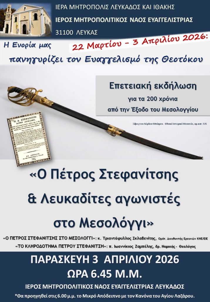- 45 μ.μ.: ΕΠΕΤΕΙΑΚΗ ΕΚΔΗΛΩΣΗ «ΠΕΤΡΟΣ ΣΤΕΦΑΝΙΤΣΗΣ & ΛΕΥΚΑΔΙΟΙ ΑΓΩΝΙΣΤΕΣ ΣΤΗΝ ΕΞΟΔΟ ΤΟΥ ΜΕΣΟΛΟΓΓΙΟΥ»